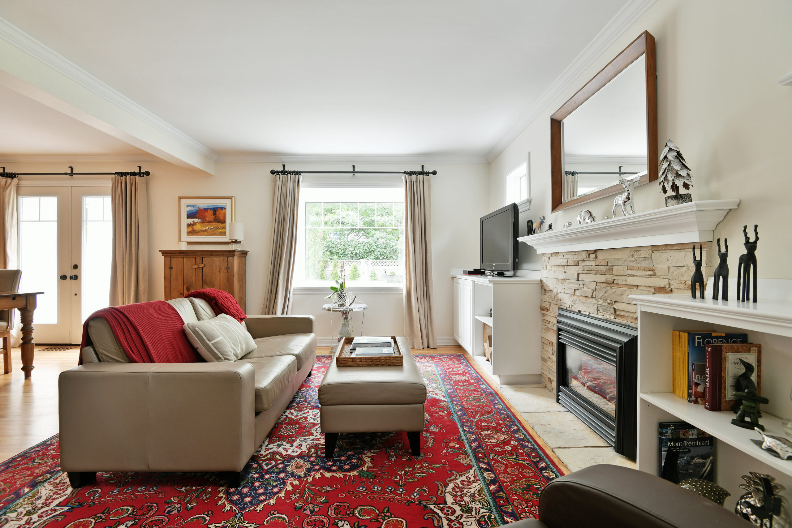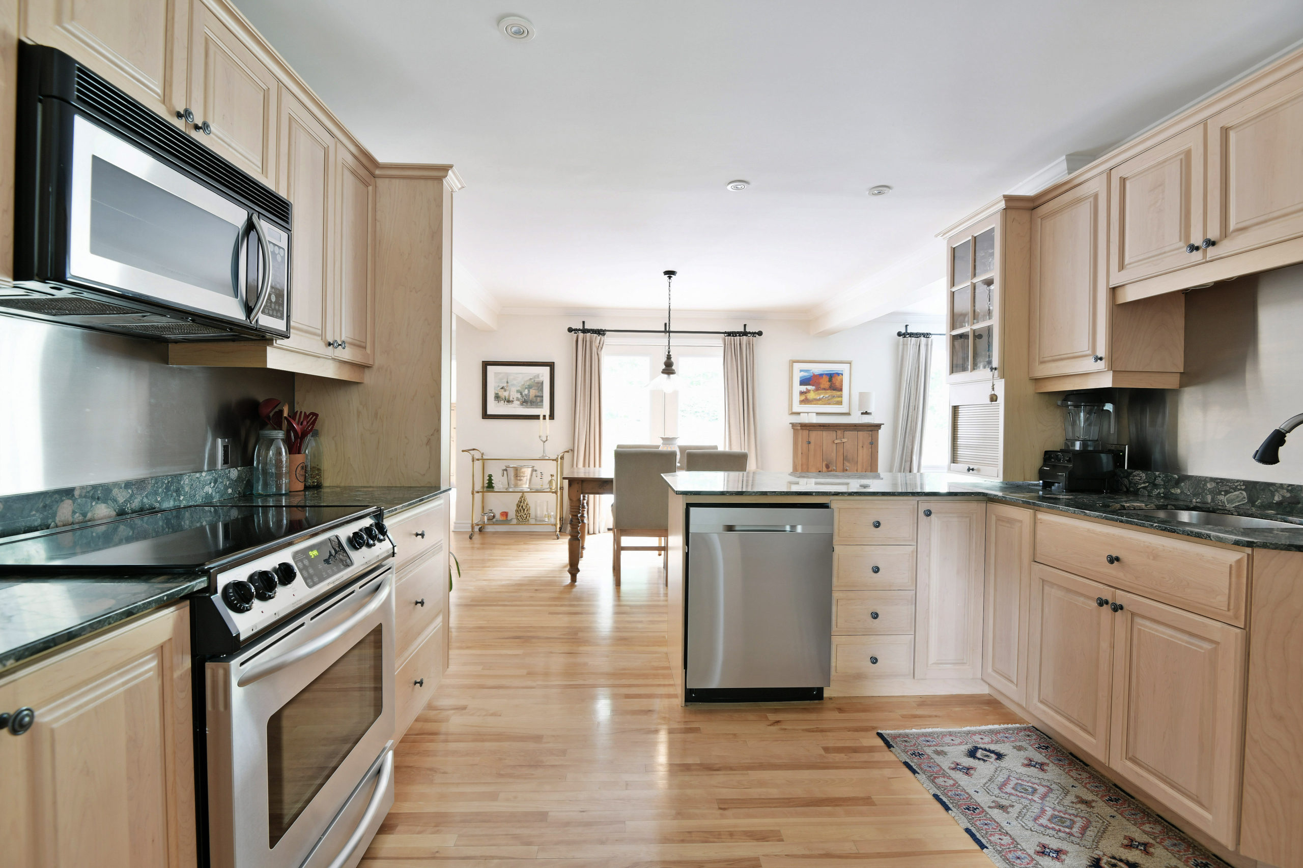 The main floor offers an open concept living/dining combination anchored with a handsome fireplace and attractive built-ins and hardwood floors. Large patio garden doors allow natural light to flood the interior and easy access to the private rear garden and large deck. There is also an entrance from the deck into the family room that is tucked away in a private spot at the rear of the home.