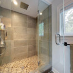 The main level powder room is privately integrated into space and has been embellished with contemporary fixtures, beaded board walls, and white carrara tiles.