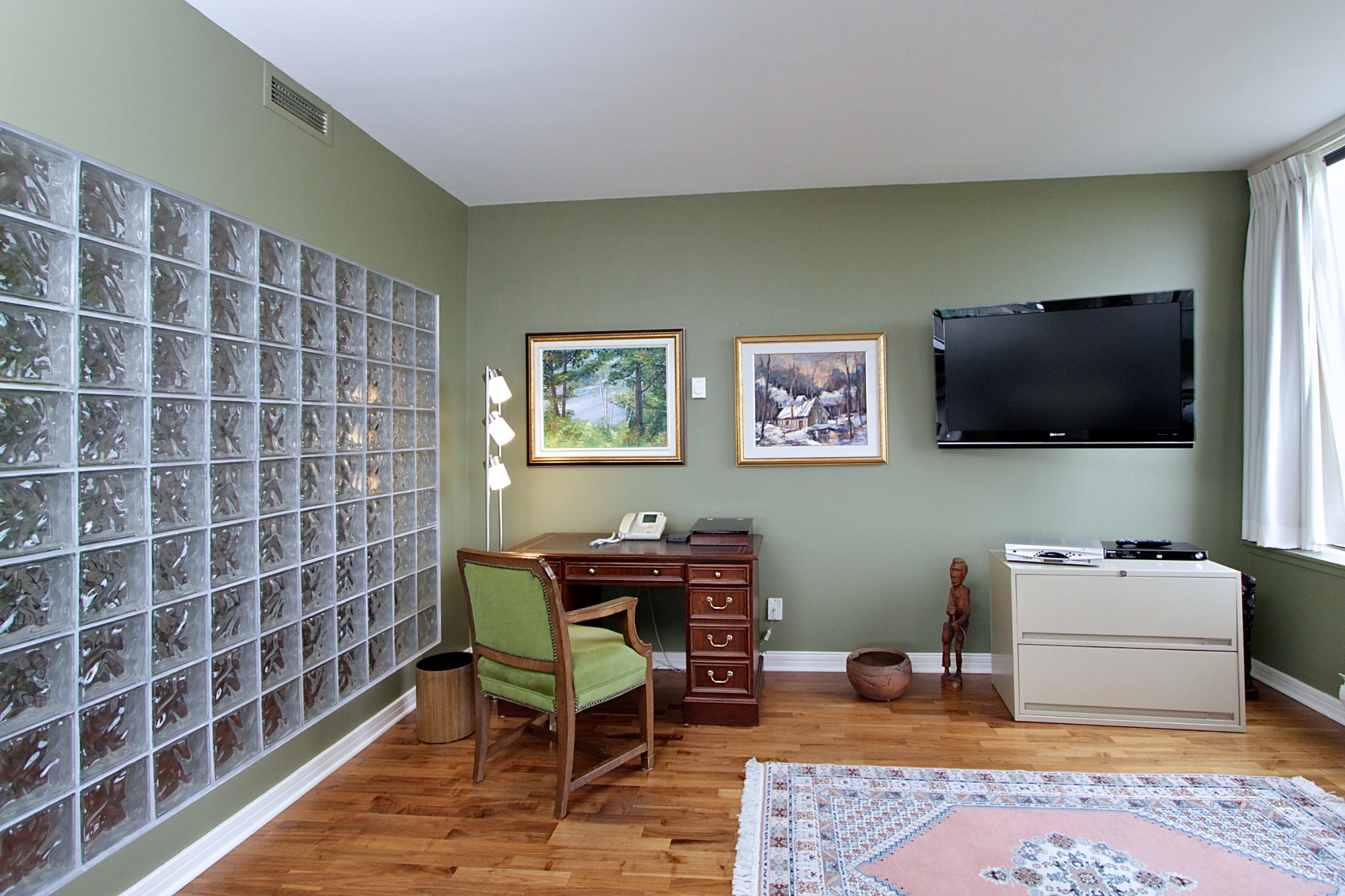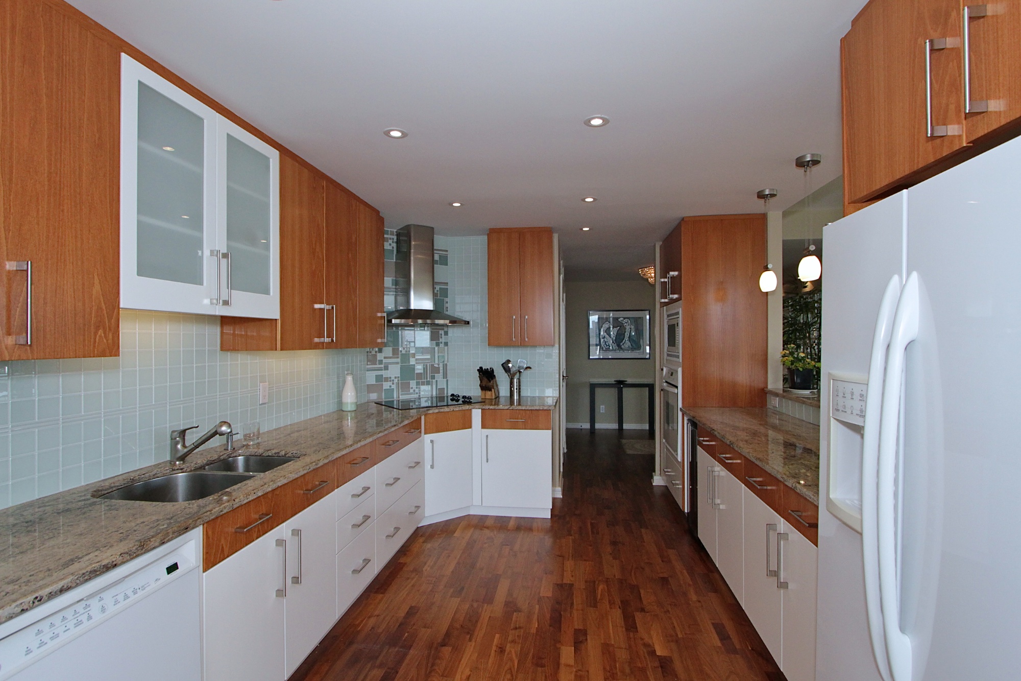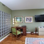 The use of glass block in the entrance foyer creates a dramatic entrance that is filled with natural light and the glass defines private space on the other side. The walnut coloured floors are a warm and perfect back drop for the balance of the design.