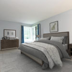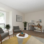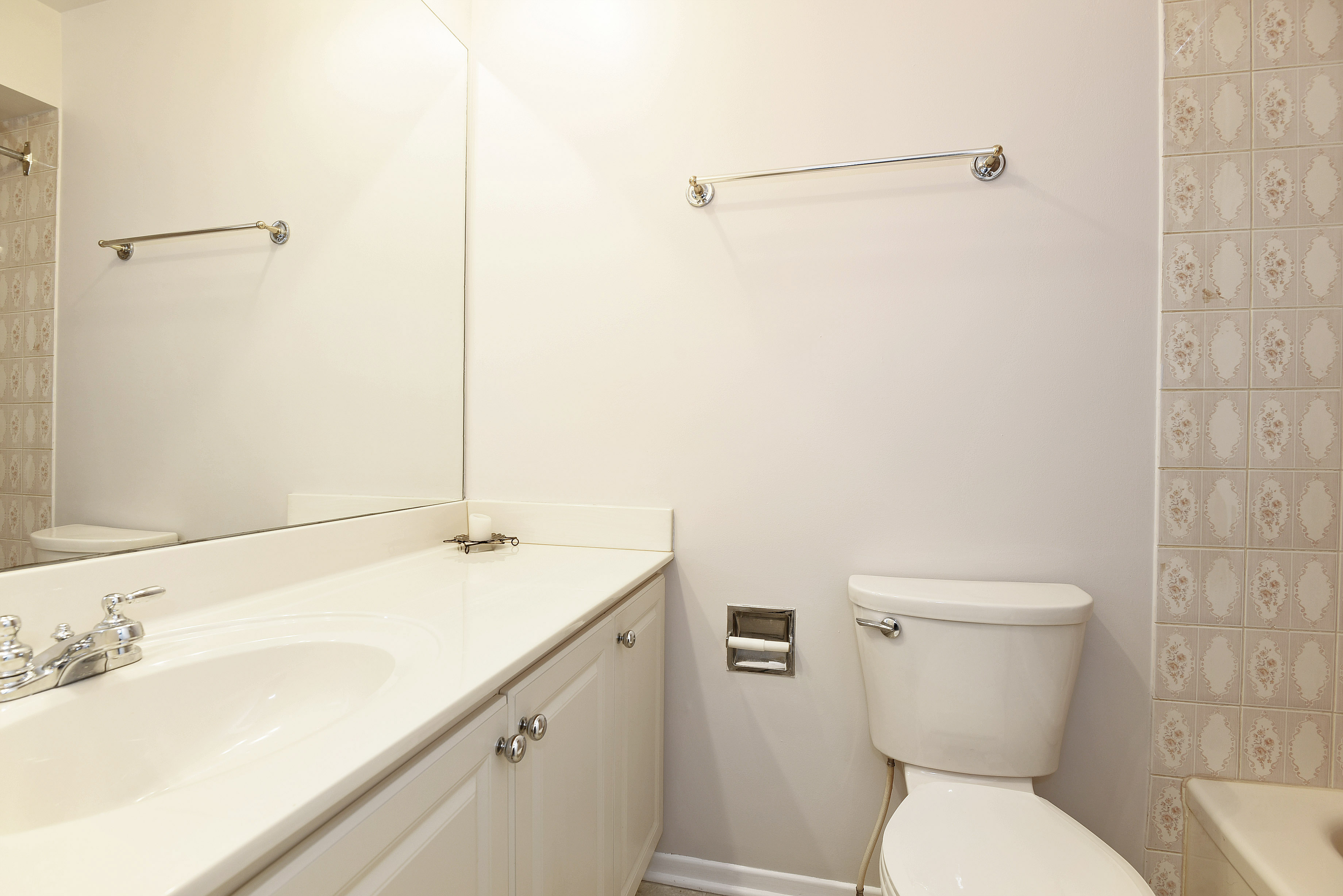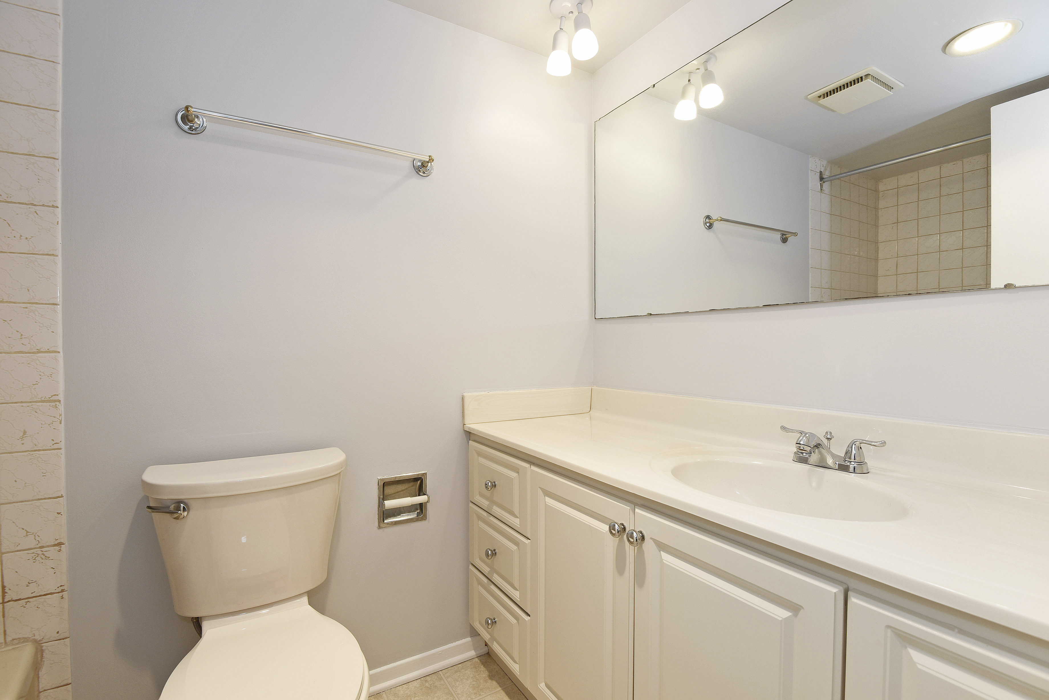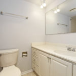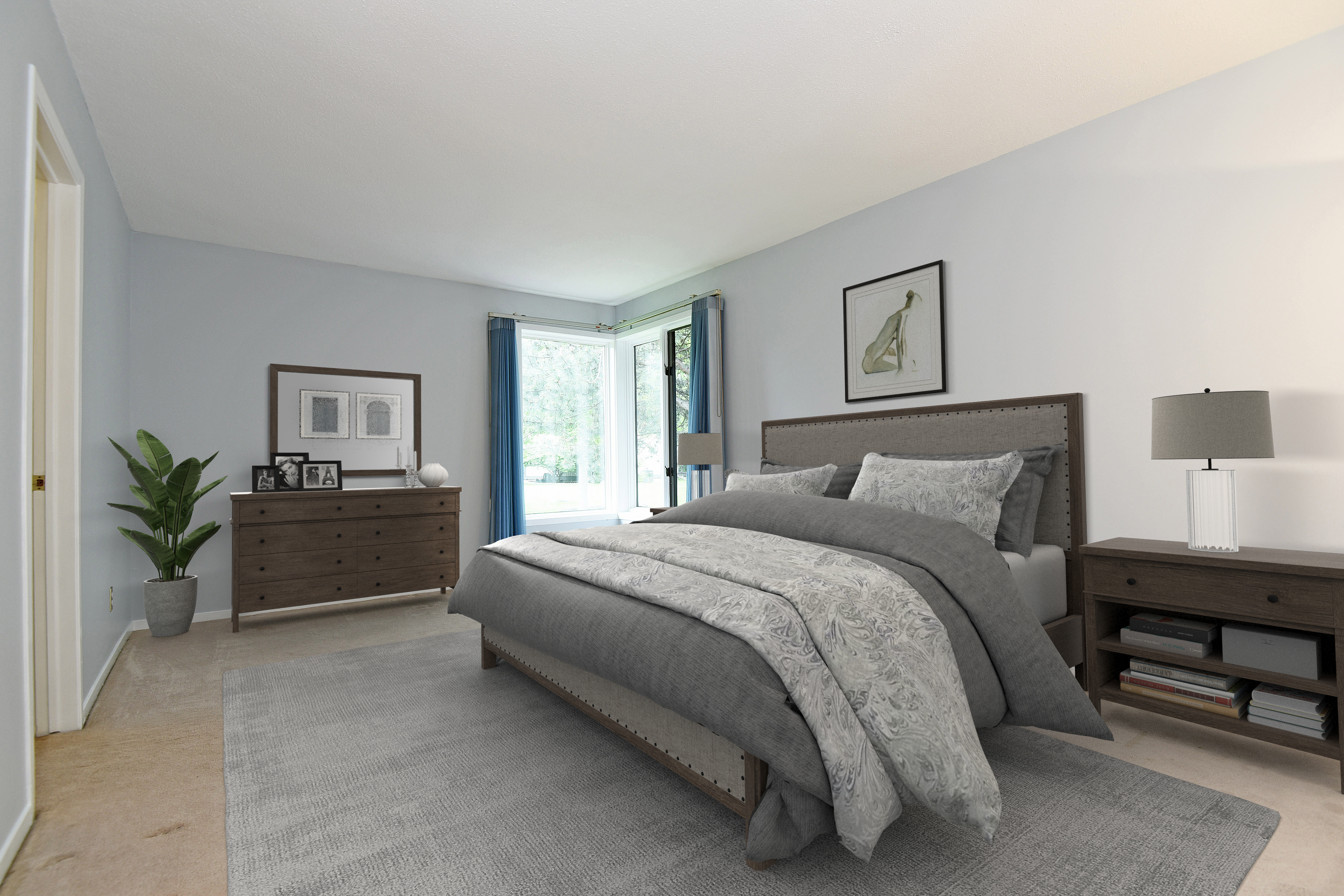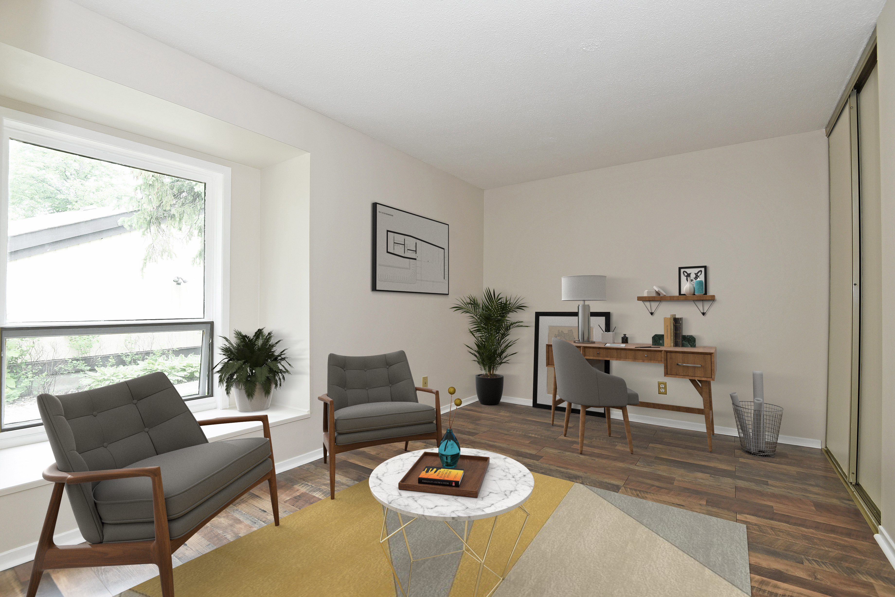 The second bedroom is currently performing as a den or study and has been updated with new wide planked dark toned flooring. The master bedroom is designed to embrace the bucolic garden setting in the rear and features an ensuite bath finished in neutral tones and a walk-in closet.
