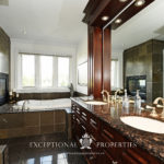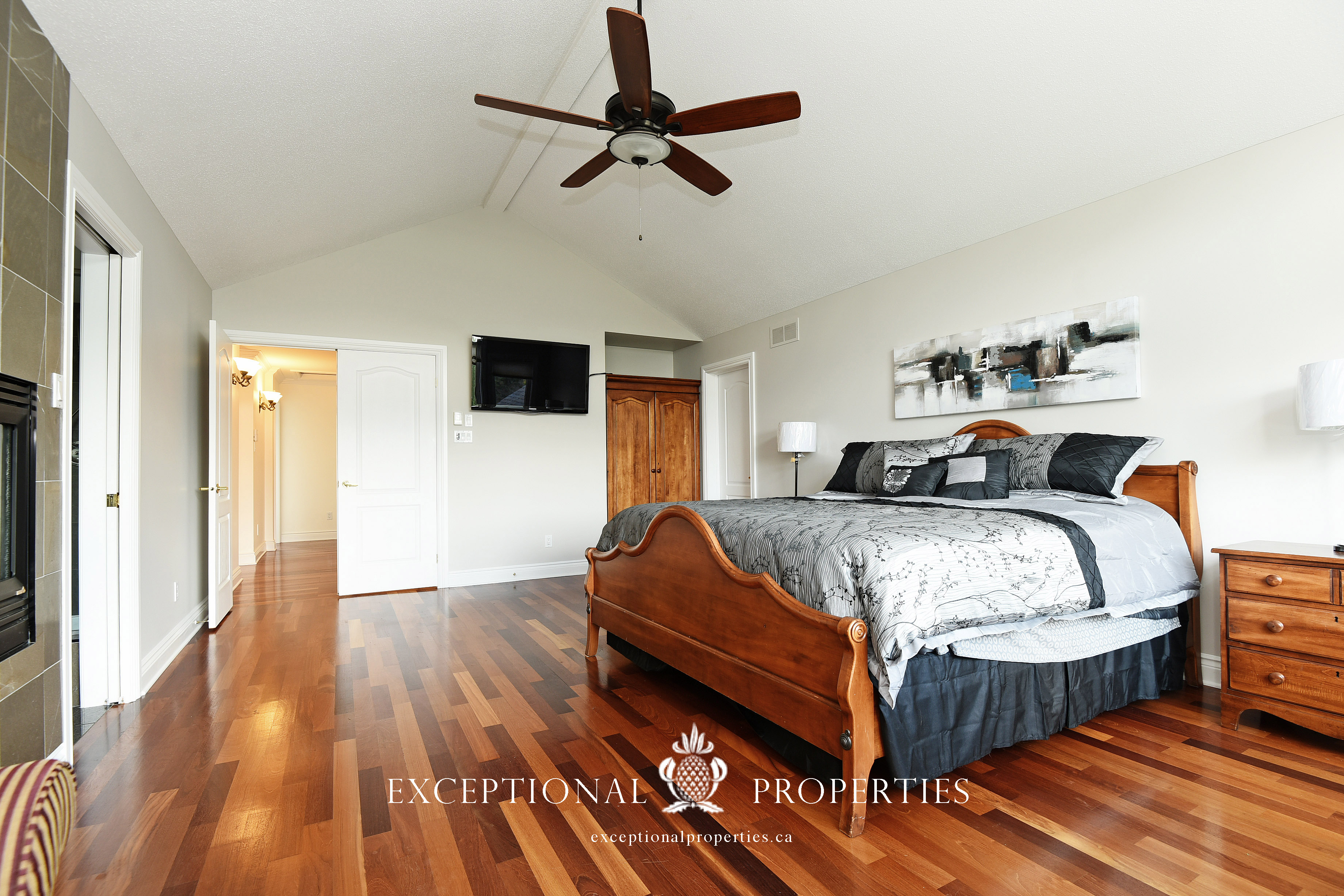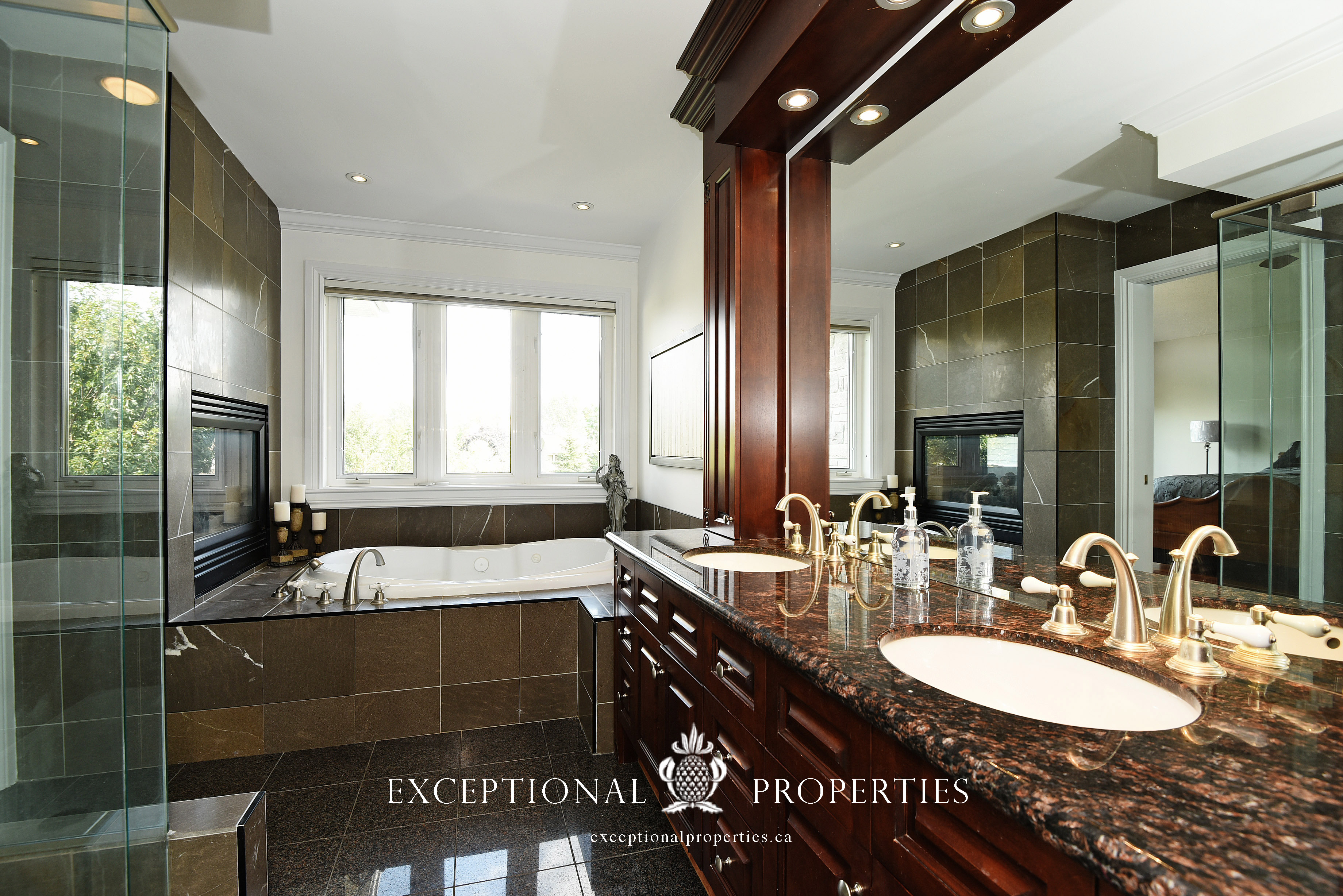 The master of this home is grand and spacious with a two sided fireplace as a focal point. The ensuite features a beautiful soaking tub, glass shower, double vanity and separate water closet. Oversized windows offer a view of the garden and morning sunrise.