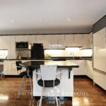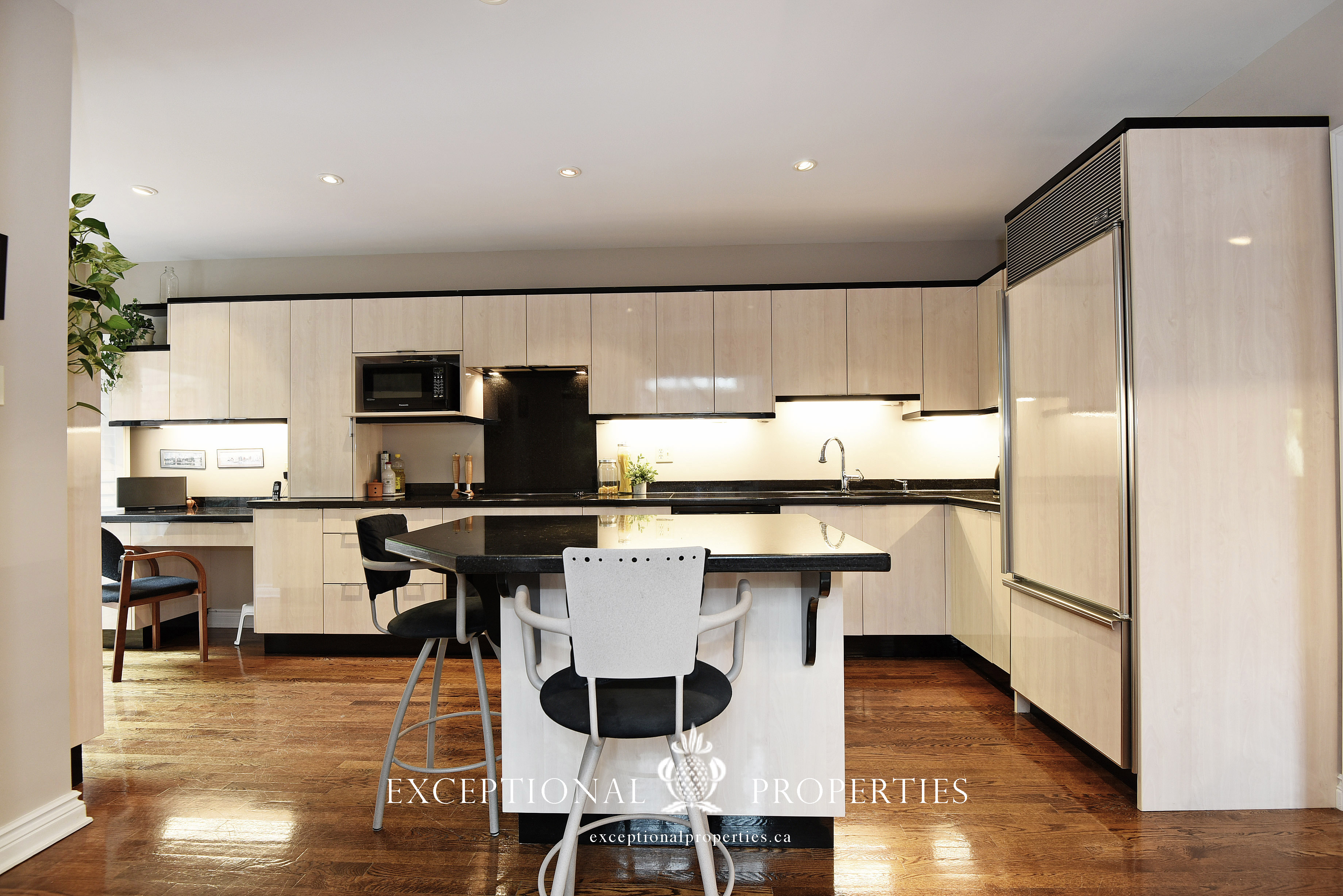 The first level boasts a contemporary kitchen with Sub-Zero and Bosch appliances, and an island and breakfast area with walk out into a charming private garden terrace on the south side of the property.