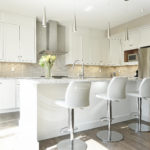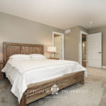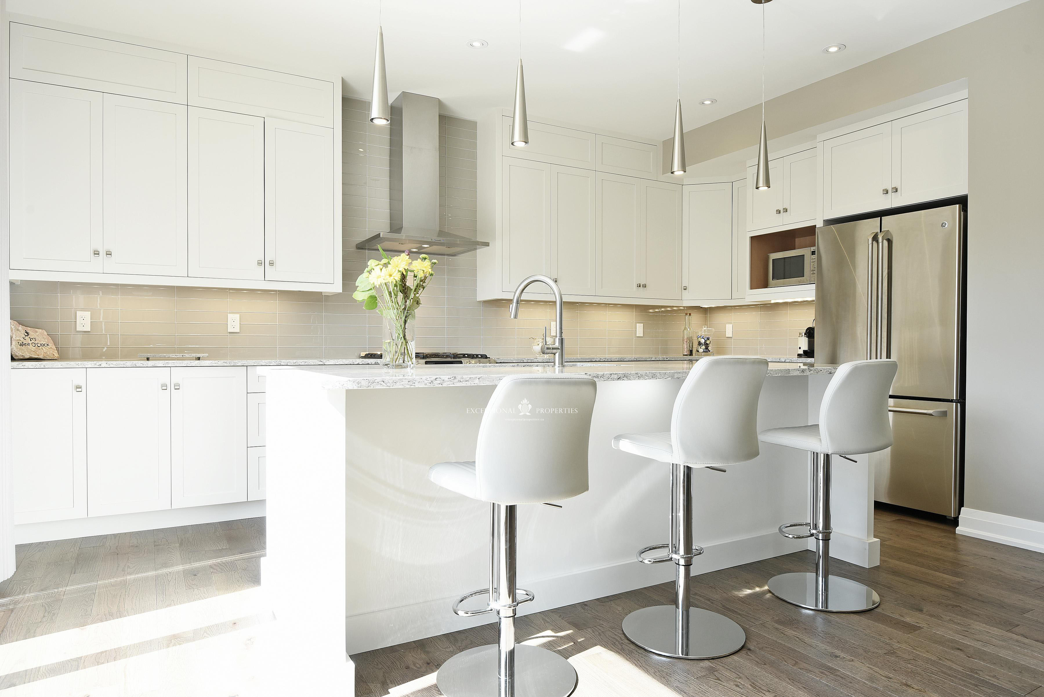A handsome floating mantle and dark wood shelving anchored around the contemporary fireplace are an interesting contrast at one end while the elegant open concept kitchen with warm white cabinets, glass tile and Cambria’s latest smooth surfaced counters are a luxe finish around terrific stainless appliances which include a gas range and hood fan, refrigerator with French doors, wine fridge and dishwasher. A walk out has been designed to access a handsome deck for grilling and entry into a private garden oasis for seasonal enjoyment.