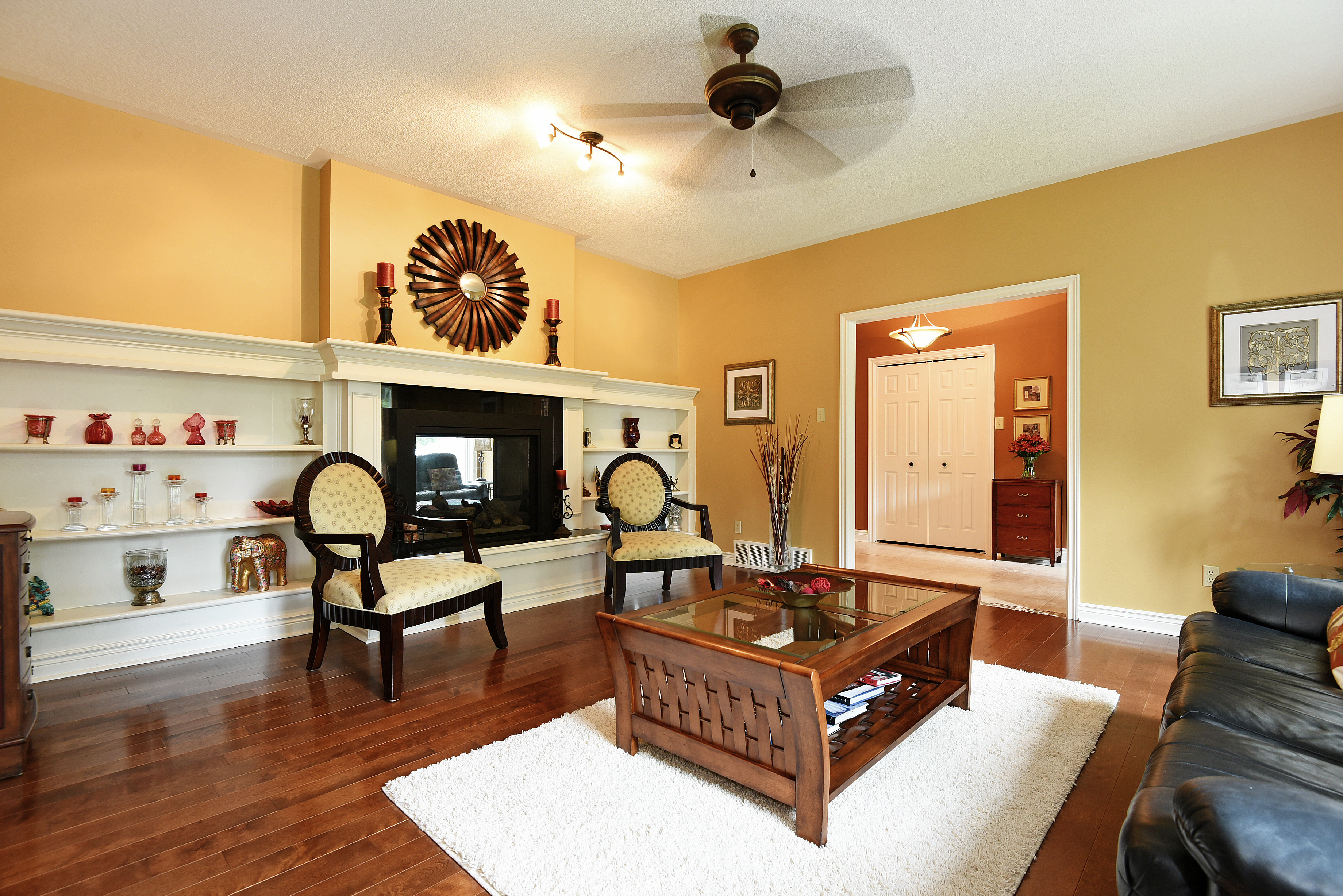 The generously scaled front entry will easily accommodate assisted walking aids should they be necessary. A spacious bedroom off to the side, currently used as a home office, is ideal for a guest area “away” from it all. The formal living room has been detailed with finely milled cabinetry, mantel and marble inlay around the 2-sided gas fireplace creating a formal yet relaxing environment.