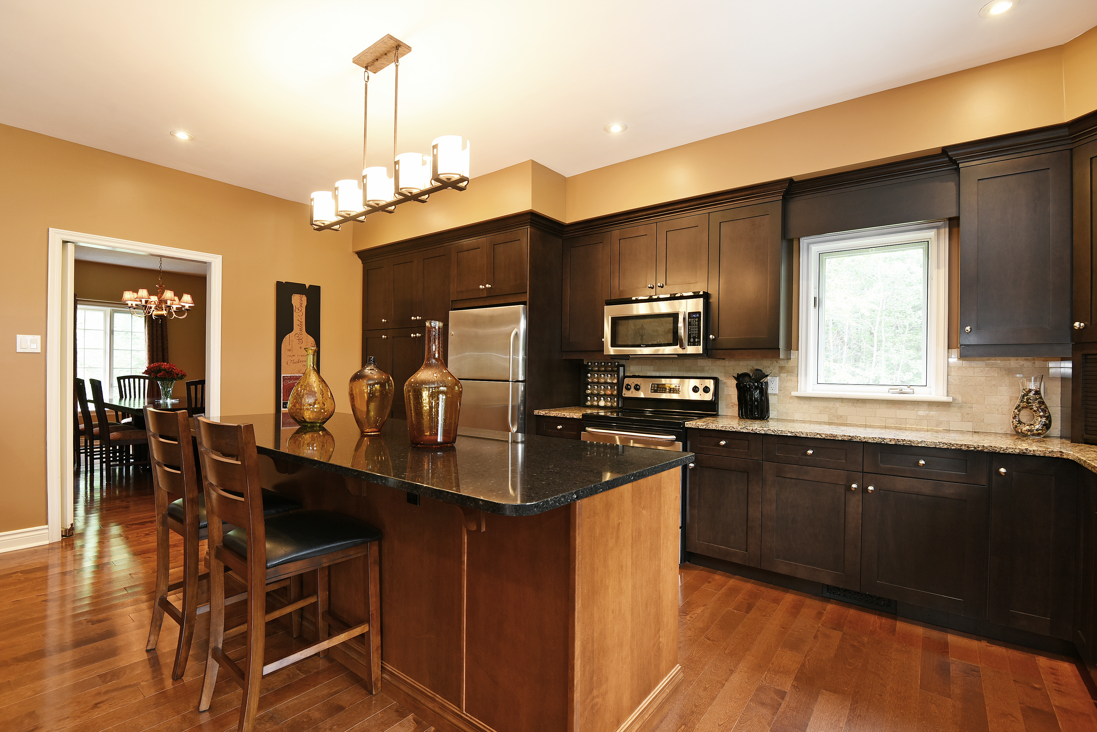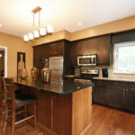 The rear of this home has been dedicated to a beautifully renovated open concept kitchen, breakfast room and family area. The kitchen is well designed with long sweeping quartz counters and the addition of a 9-foot island is ideal for food prep and casual dining. The breakfast area and family room share the gas fireplace, finished on this side with stone surround and a solid wood mantel that beautifully complements the richly toned chocolate hardwood floors. This area is flooded with natural light and provides convenient access to the expansive deck, BBQ, patio and rear gardens.