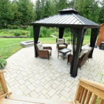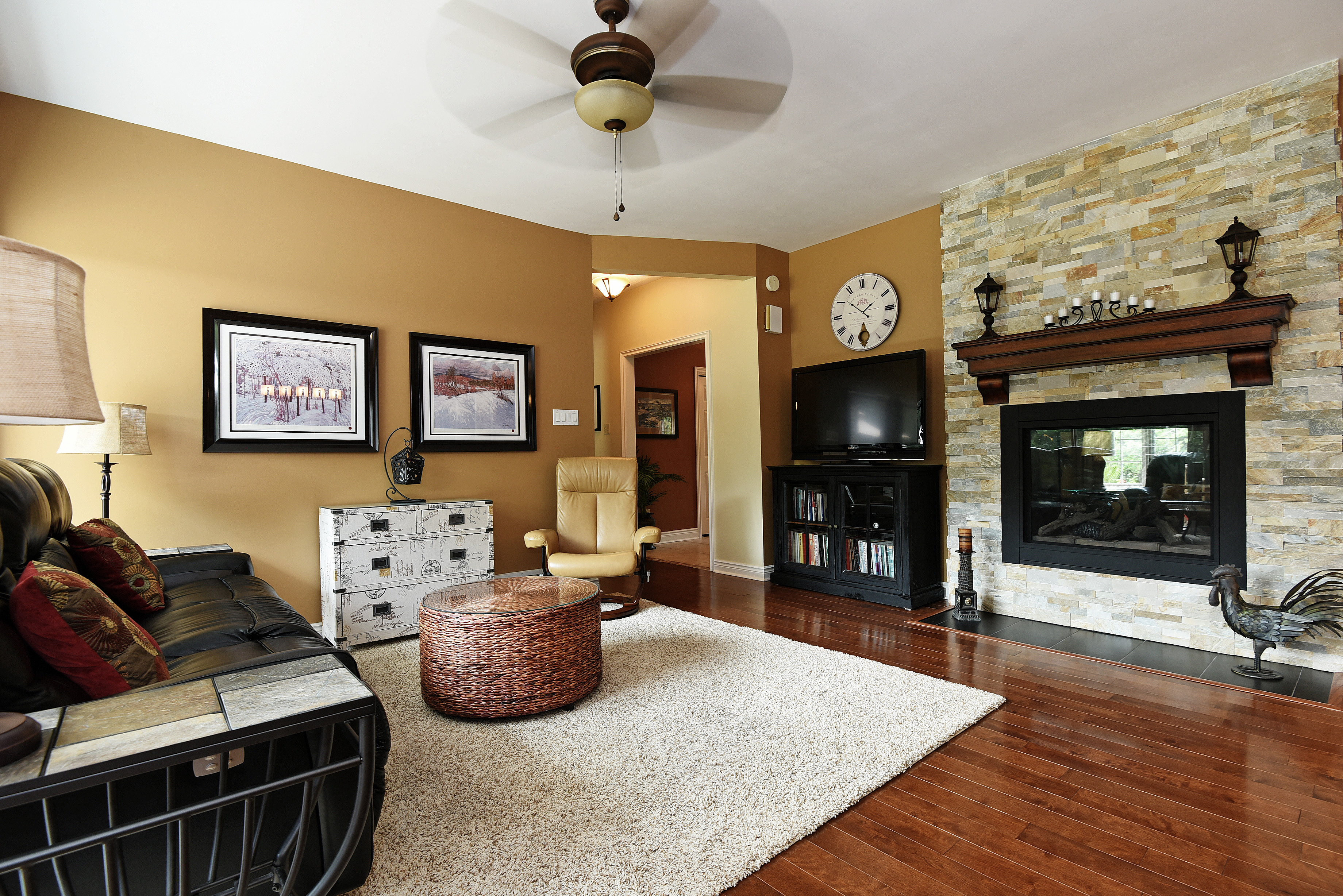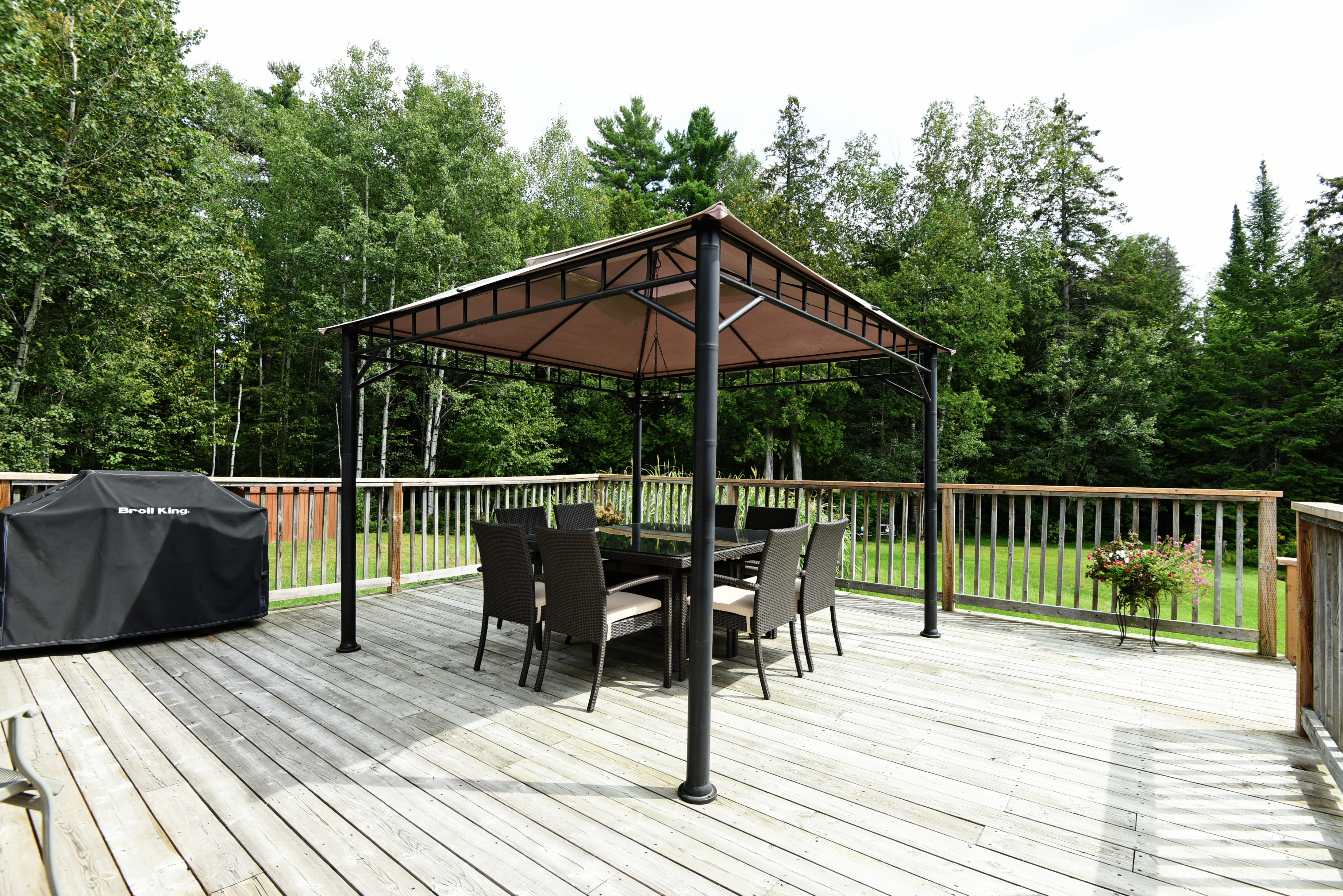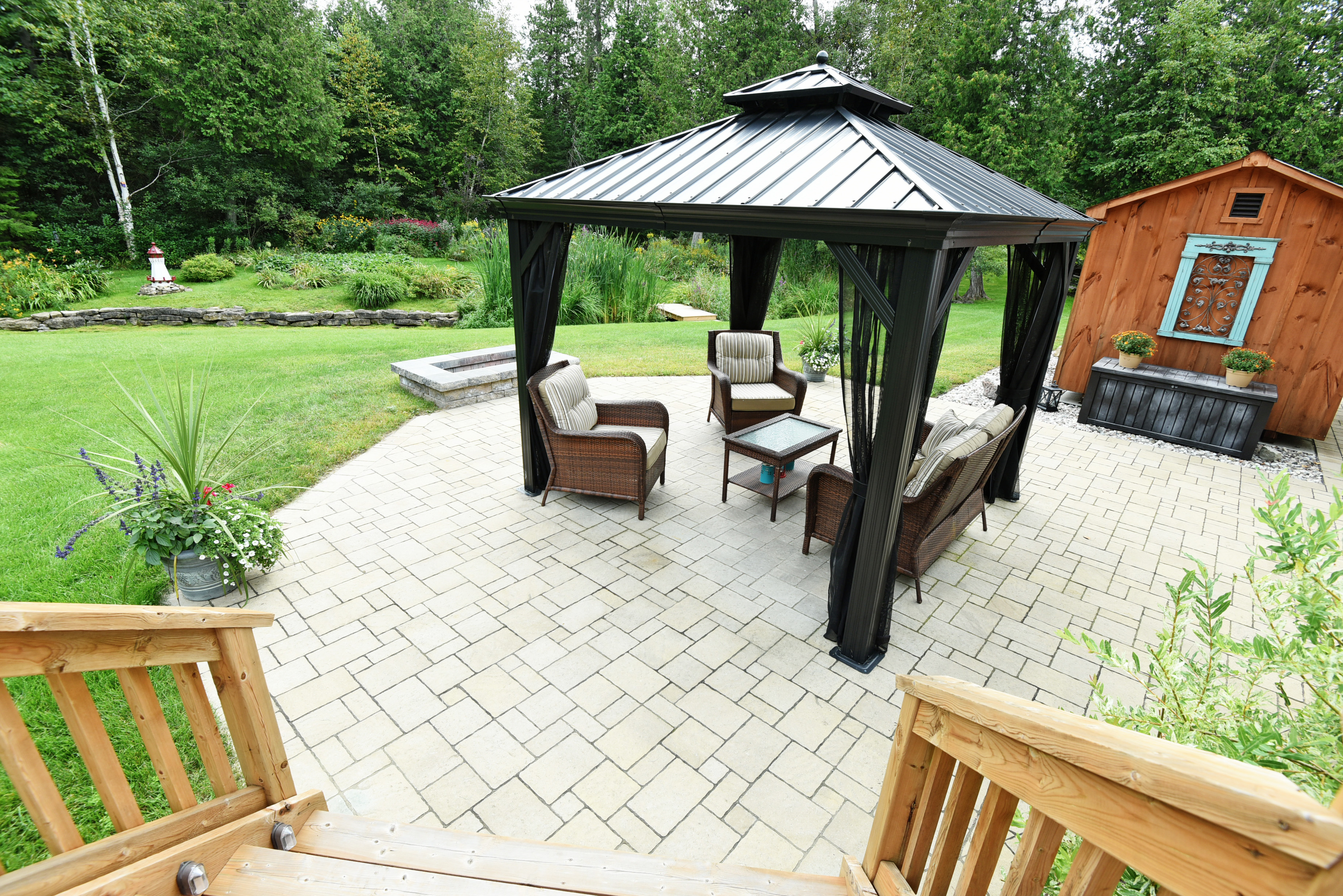 The master suite has been luxuriously appointed with a generous 3-piece ensuite and features a glass shower enclosure with a rain shower head. The warm toned tile is the perfect complement to dark stained wood cabinets. The master also boasts a walk out into the rear garden and the park like setting that has been landscaped with an island focal point. A variety of seating areas provide sun or shade throughout different times of the day. Enjoy summer evening campfires under the gazebo that’s adjacent to the stone fire pit.