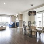 The dining room is well proportioned and features a large window that defines the space while the living room is anchored by a handsome gas fireplace and walkout to an oversized balcony.