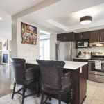 The second level is dedicated to an island kitchen with white quartz counters, marble tiled backsplash, and stainless steel appliances with a breakfast area that boasts a south-facing window.
