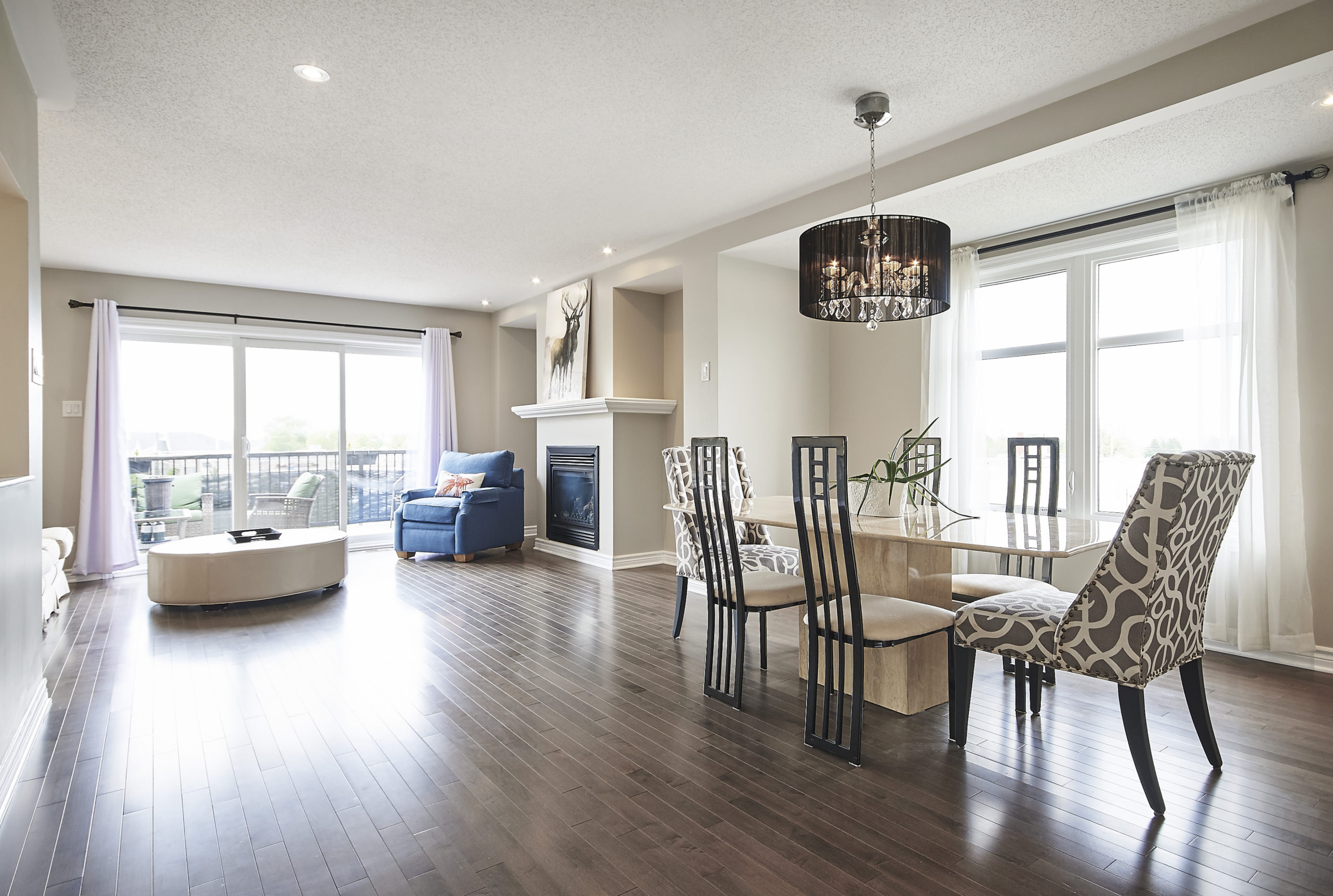 The dining room is well proportioned and features a large window that defines the space while the living room is anchored by a handsome gas fireplace and walkout to an oversized balcony.