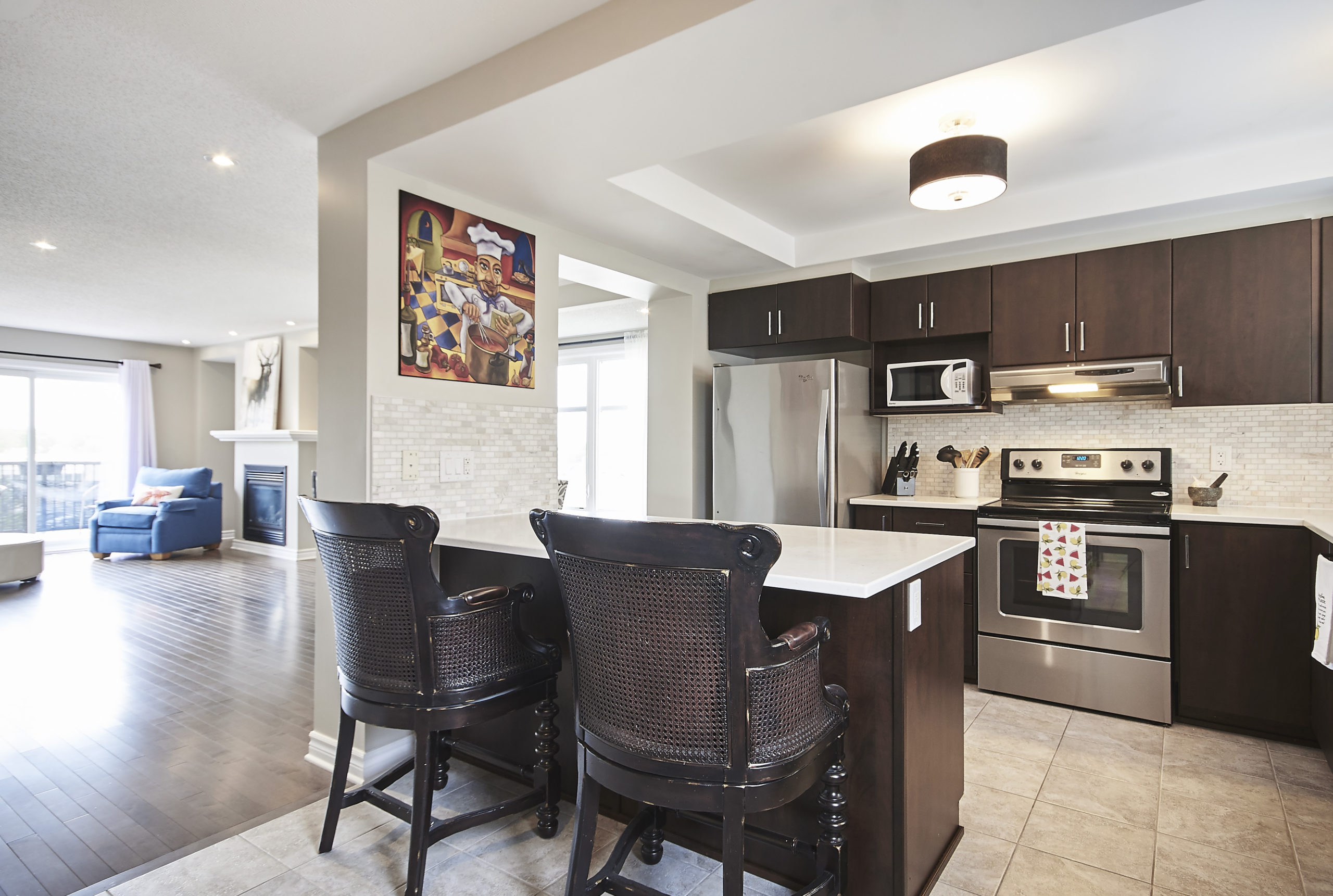 The second level is dedicated to an island kitchen with white quartz counters, marble tiled backsplash, and stainless steel appliances with a breakfast area that boasts a south-facing window.