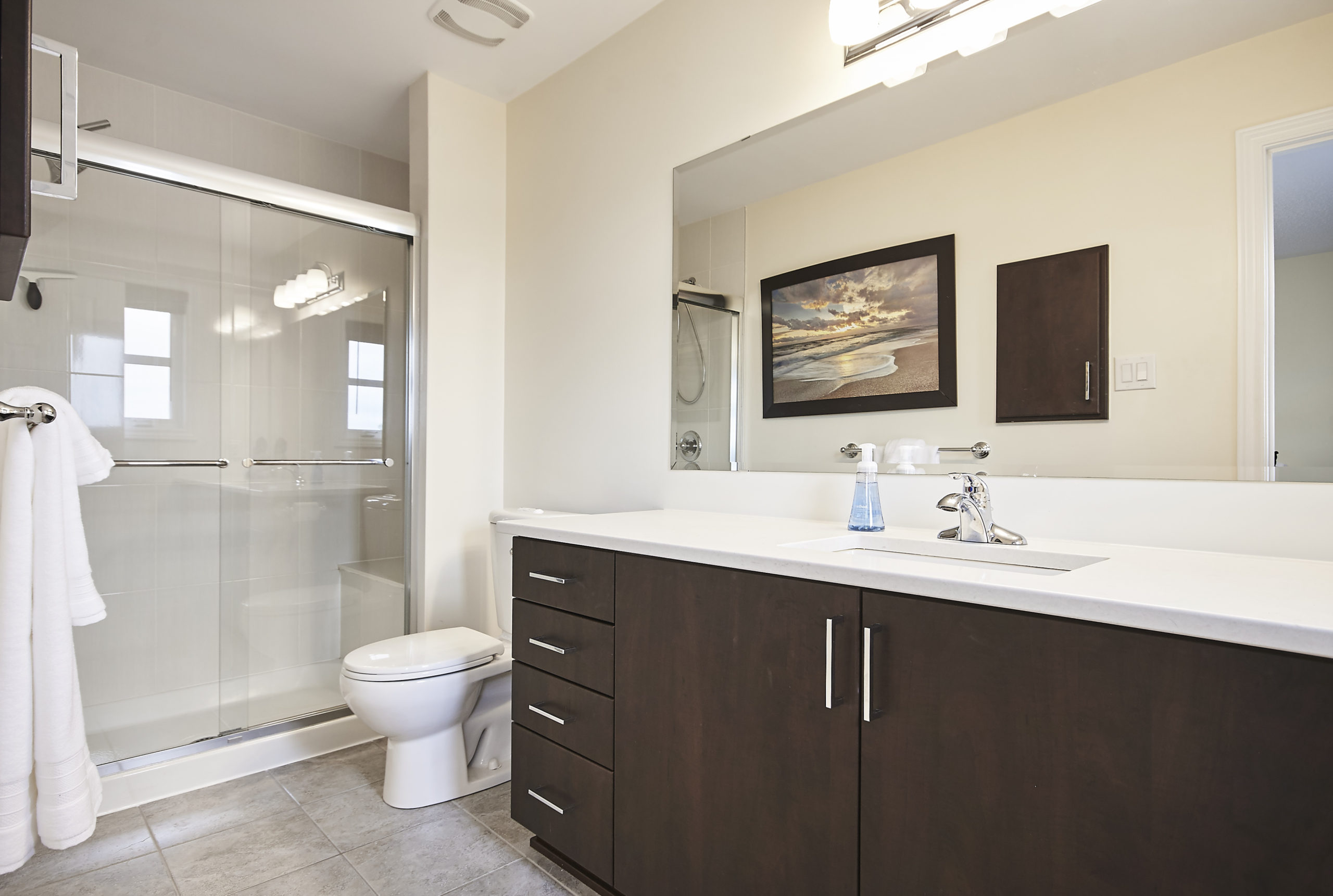 Three well-proportioned bedrooms and 2 1/2 baths—with the master ensuite boasting a long, quartz vanity surface and shower enclosure with bench seating—are featured on the third level away from entertaining space.