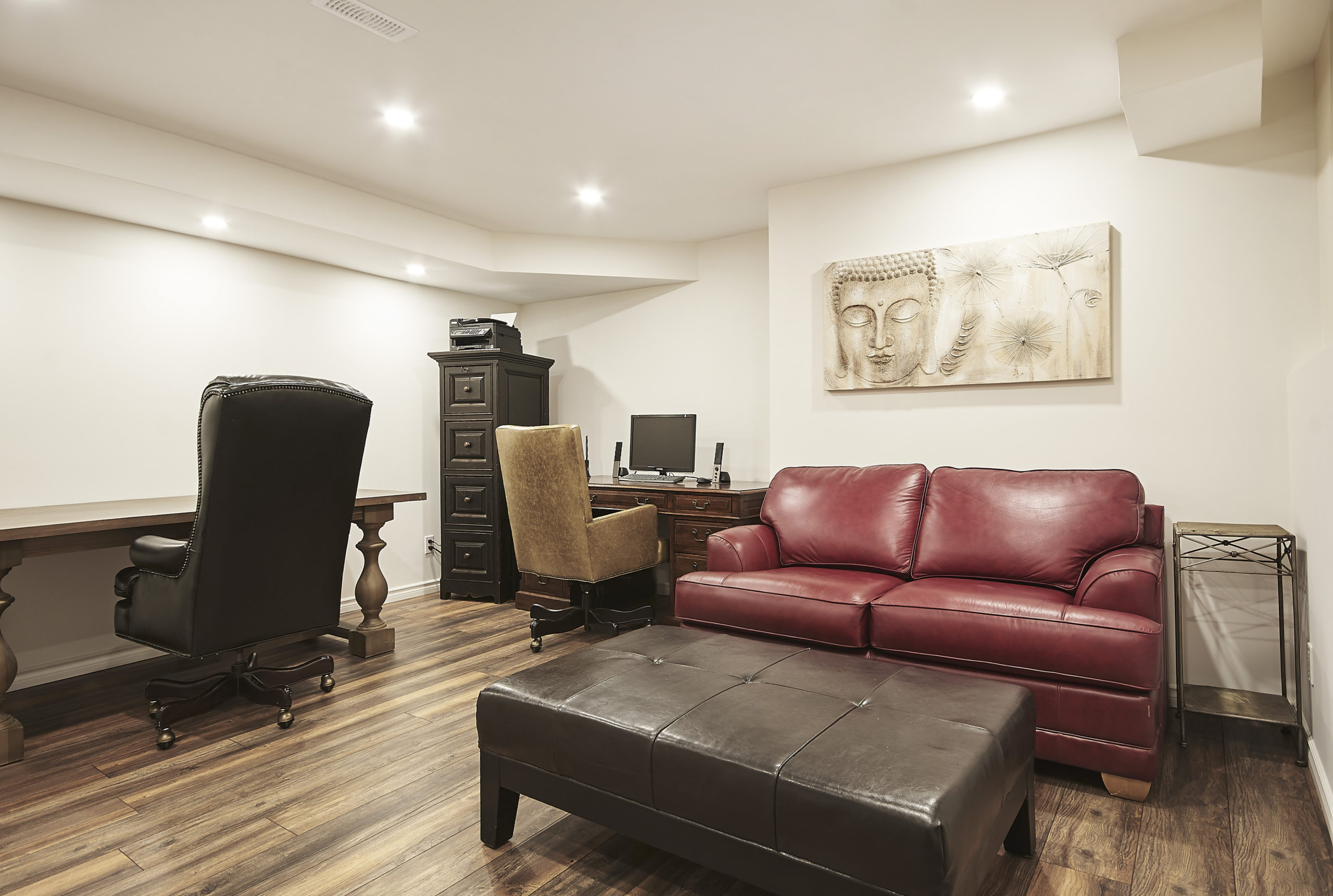 The lower level is partially finished with dark, wide-planked laminate flooring and is the ideal space for a home gym or office. There are well-appointed closets and plenty of storage.