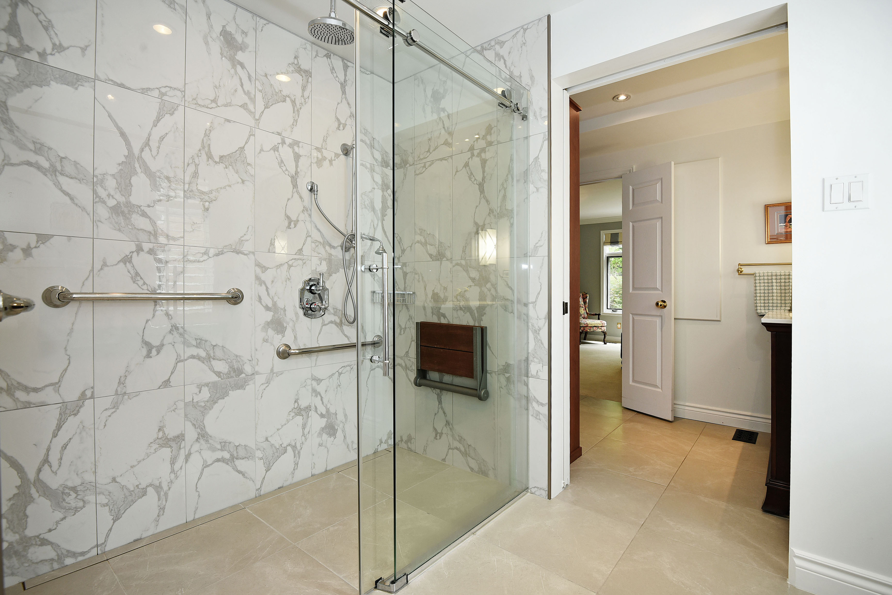 Astro Design has recently completed a stunning main bath to compliment the already luxurious appointed master ensuite that boasts a glass, curbless shower with multiple shower heads and handsome vanity.