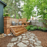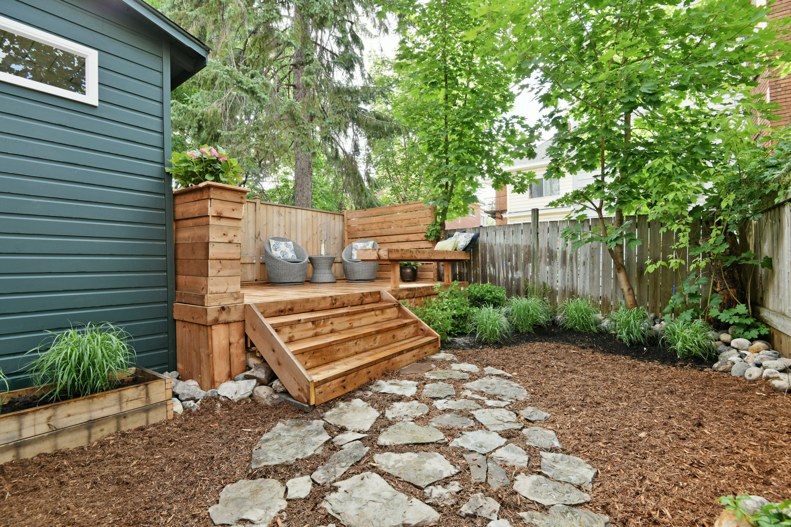 The garden terrace is well planned with built-in seating overlooking a well-tended private and fenced garden with a mature landscape.