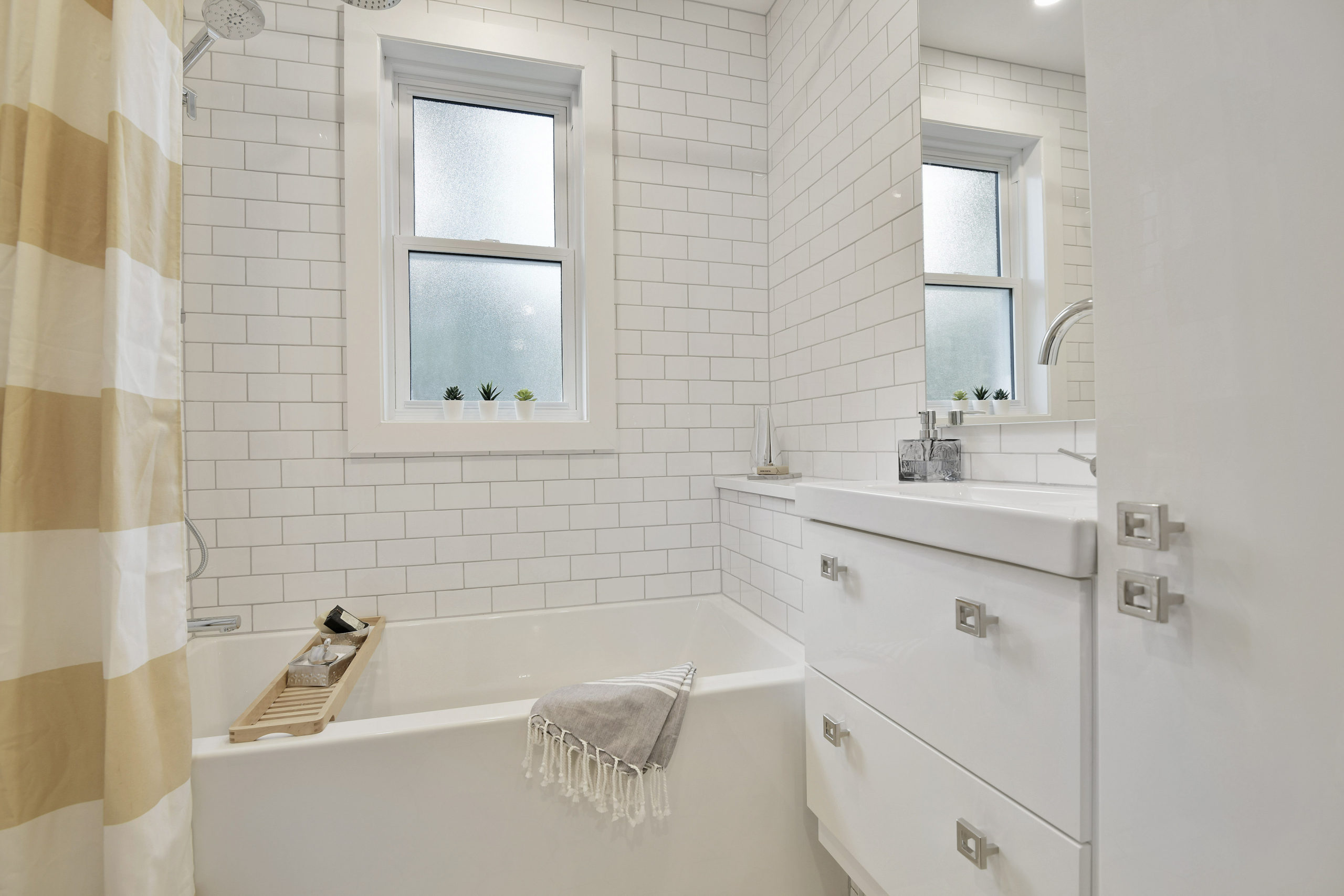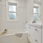 The second level features three bedrooms with a crisp, white main bath, timeless subway tiles, and contemporary floor tiles, all designed with efficient use of space to include a storage tower and extra shelving in the tub enclosure.
