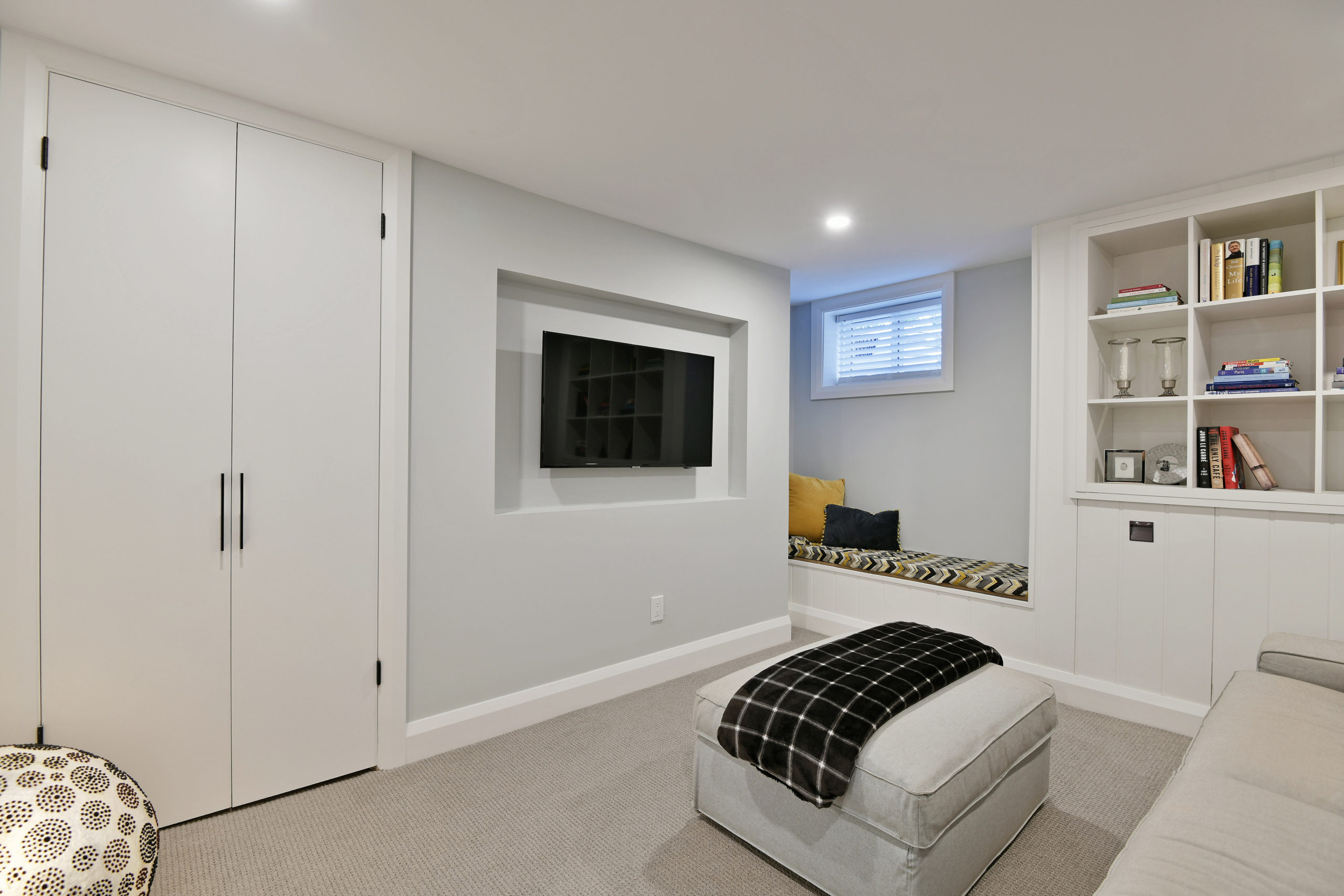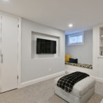 The lower level is finished with the same quality of finish as the rest of the house with custom built-in shelving and window seating focused around the media screen to accommodate family movie night or guest space with a custom 3 piece bath and glass shower enclosure just down the hall.