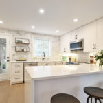 Wide planked, white oak floors throughout create a perfect base that has been layered quietly with carefully selected details. The trim throughout has a simple and pure line giving dimension while the counter to ceiling backsplash in the kitchen creates the perfect sightline upon entering this elegant space.