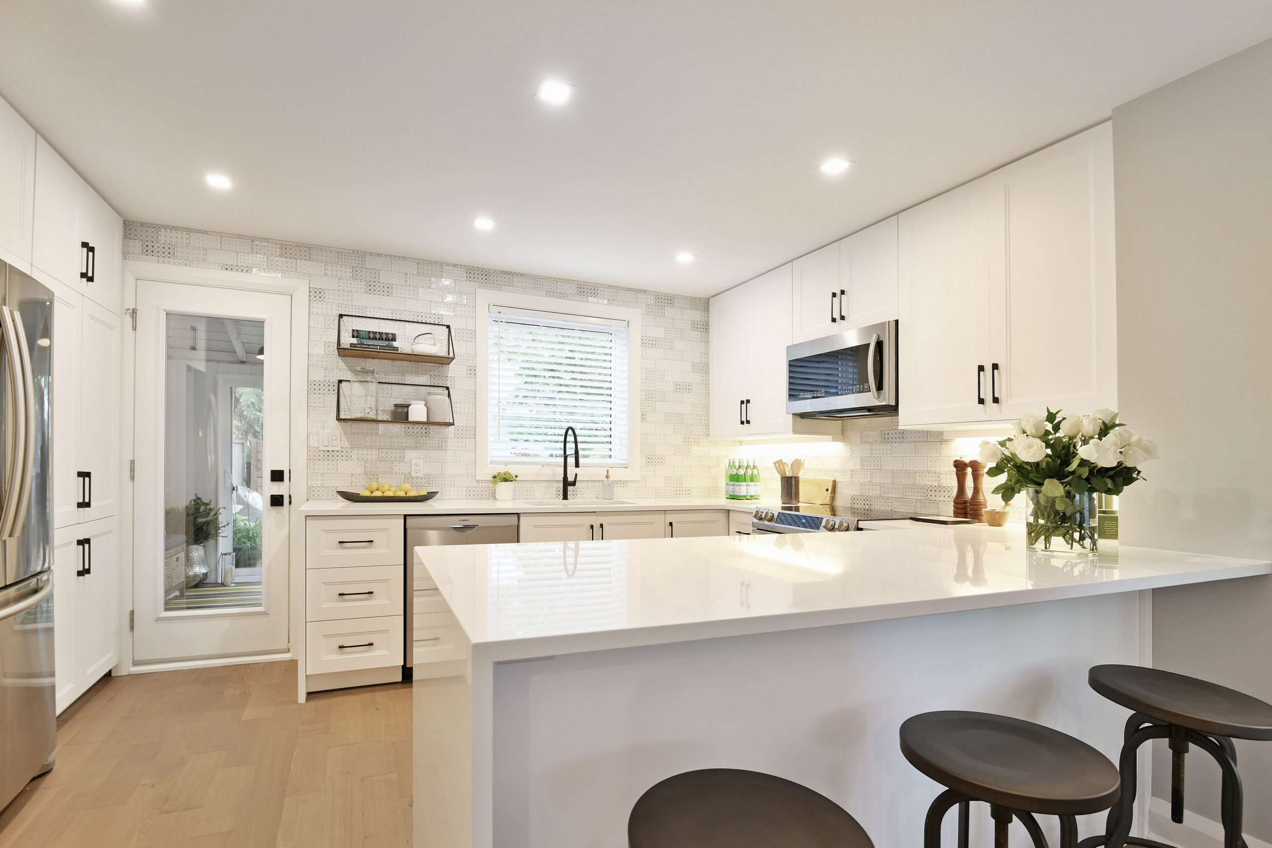 Duel white quartz waterfall edges on the counters create a sleek backdrop for the stainless appliances and well-planned kitchen layout that features pot lights, under counter lighting, large stainless sink, pot drawers that fully open and plenty of additional storage.