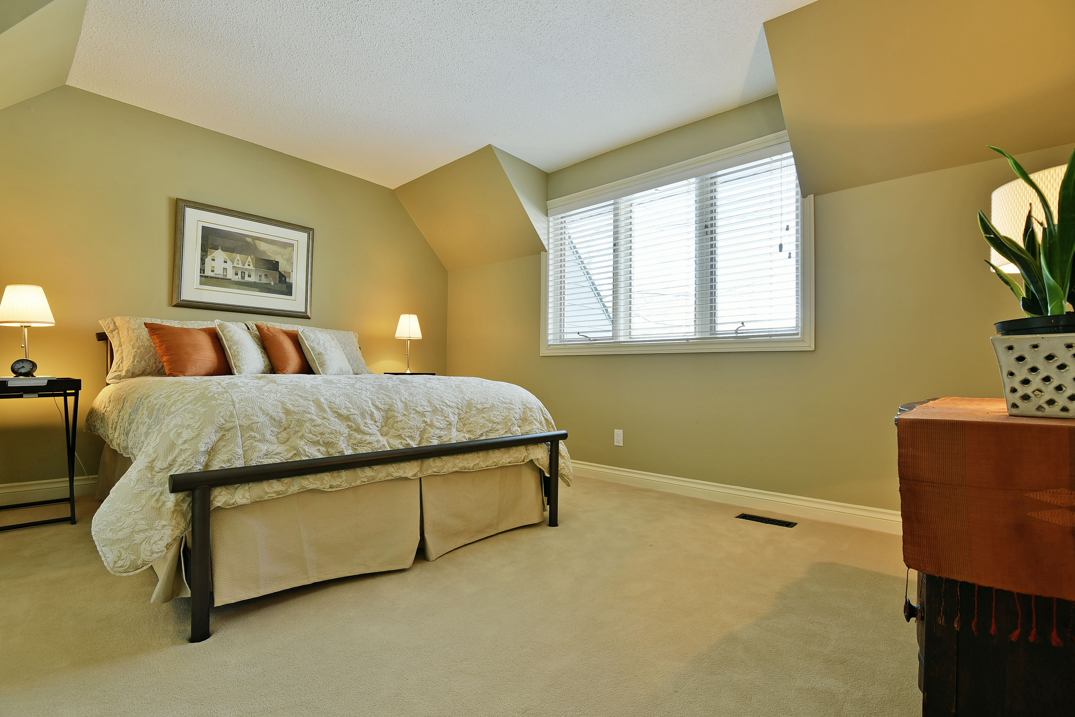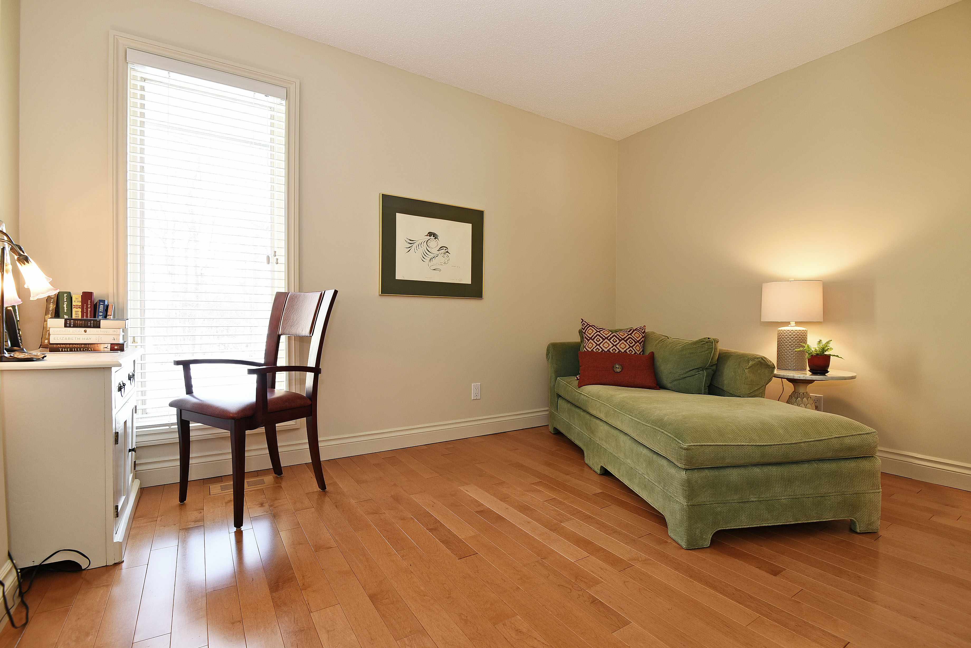 The master suite is most assuredly luxe space. The sleeping quarters are more than generous with a separate seating area warmed by a wood burning fireplace. A large walk-in closet with built-in storage is helpful for organizing but this suite also offers a private study with built-in shelving and hardwood floors which can easily be a room for an infant or designed as the fourth bedroom on this level. The 4-piece ensuite bath boasts granite counters and updated tap sets.