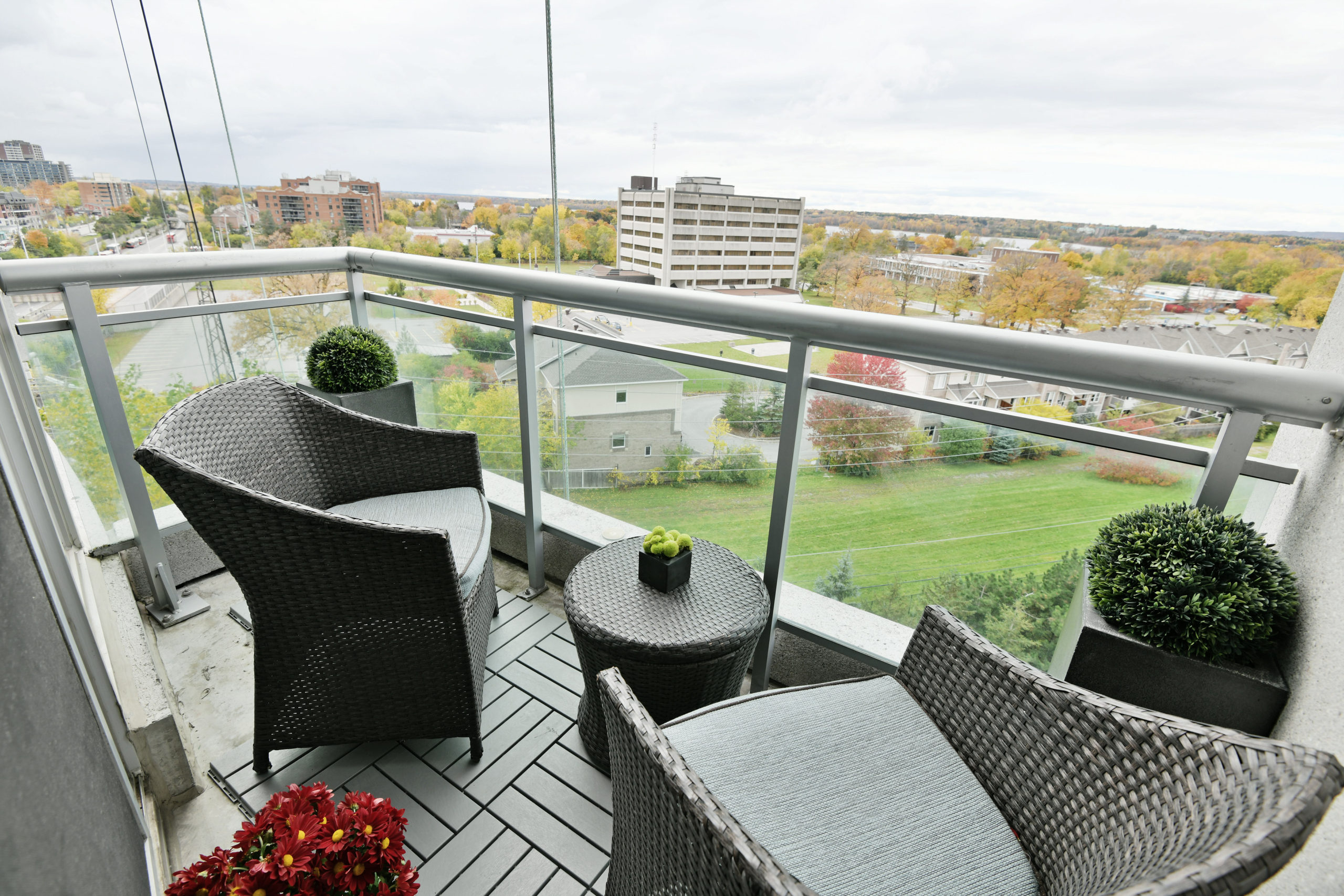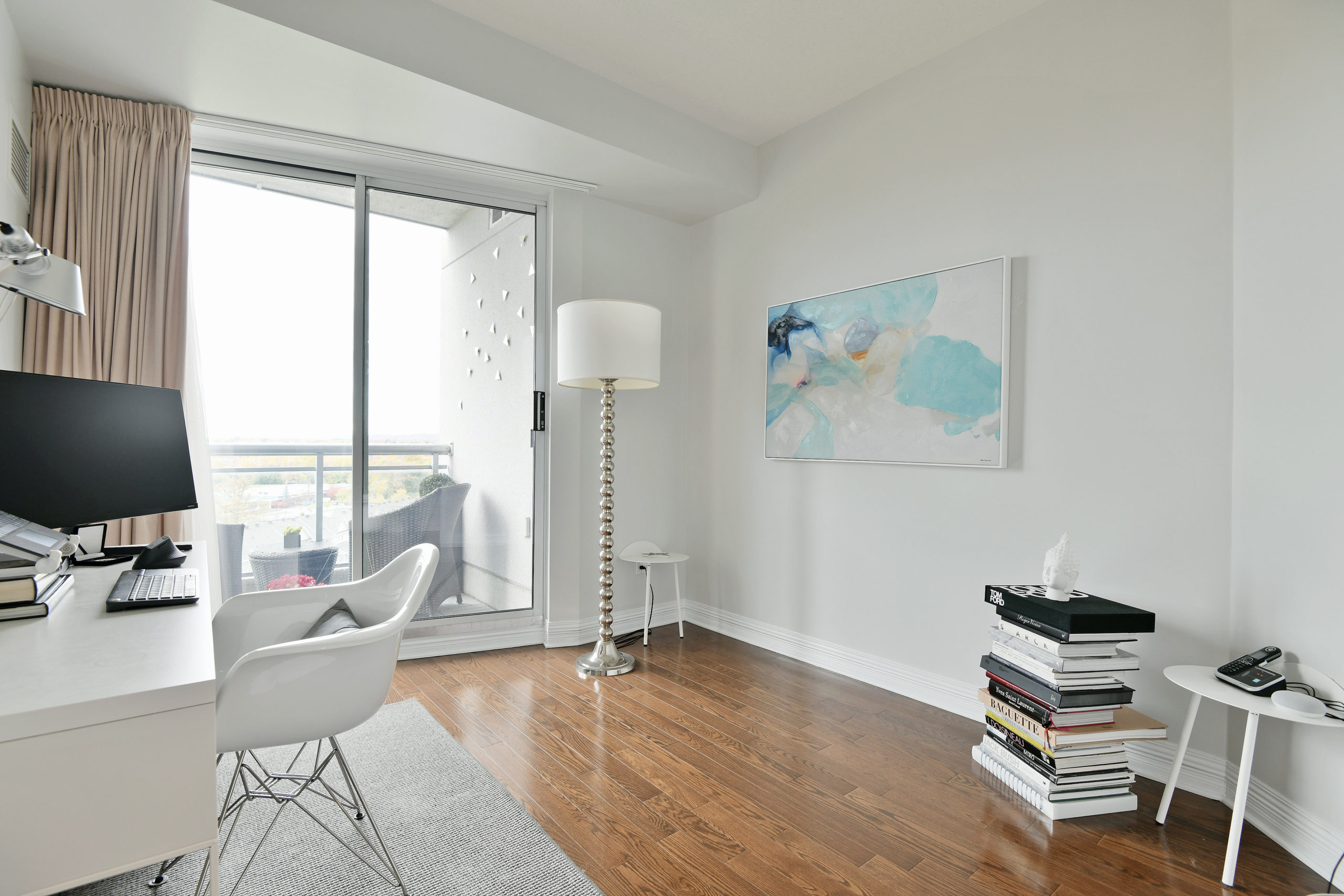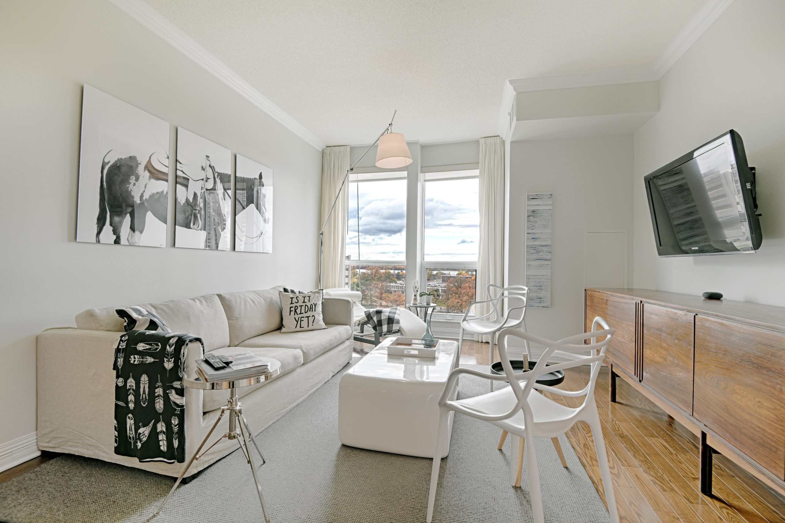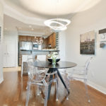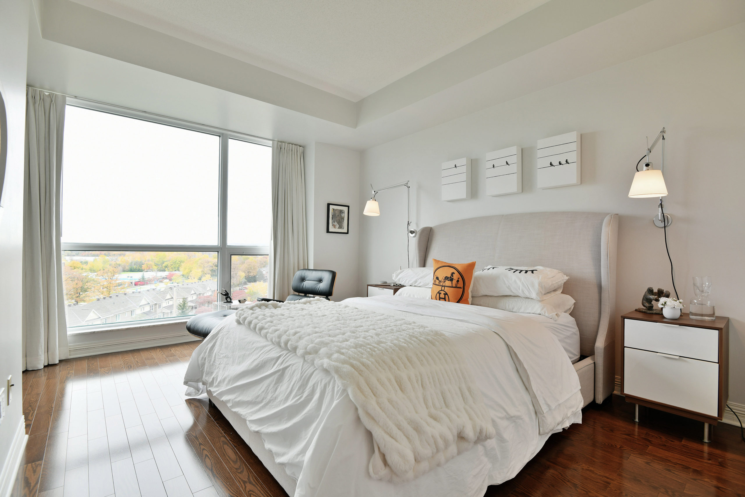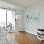 Urban living with style and views is a rarity, and The Metropole offers luxurious hotel-like living. With 24-hour concierge service, amenities such as pool, gym, private meeting rooms and three guest suites, simple pied-à-terre living is very doable. A clean and sleek palette with views of the Gatineau Hills, Ottawa River and beautiful sunsets, suite 704 is ideal for those looking for reduced space without trading off luxury. Trim and millwork add dimension while design details such as gauzy custom linen draperies with black out liners create a light and airy feeling in the sky. Stone surfaces in the kitchen and baths and contemporary elements like the custom wall art in the en-suite enhance the interior’s contemporary edge.