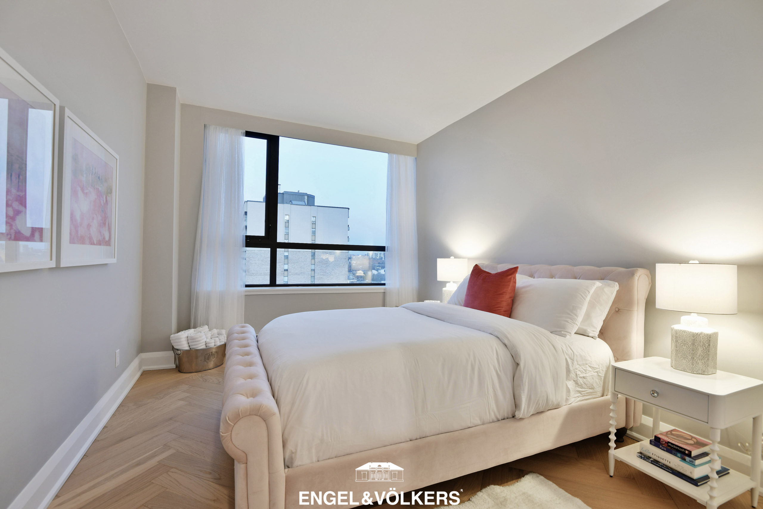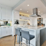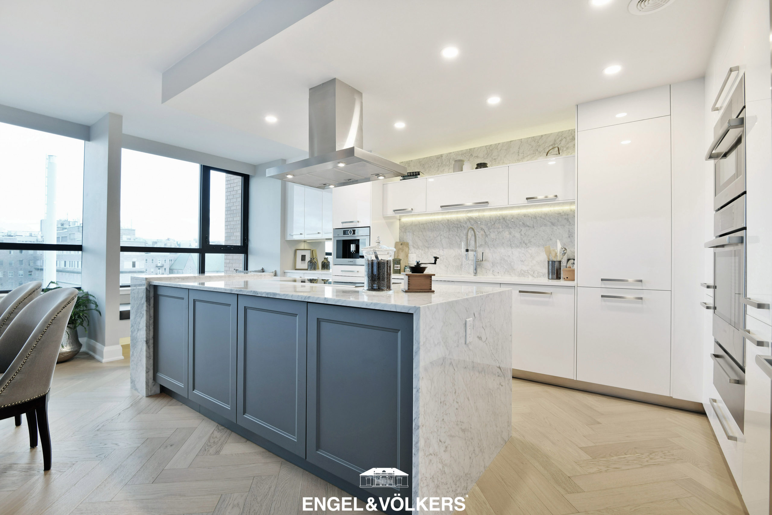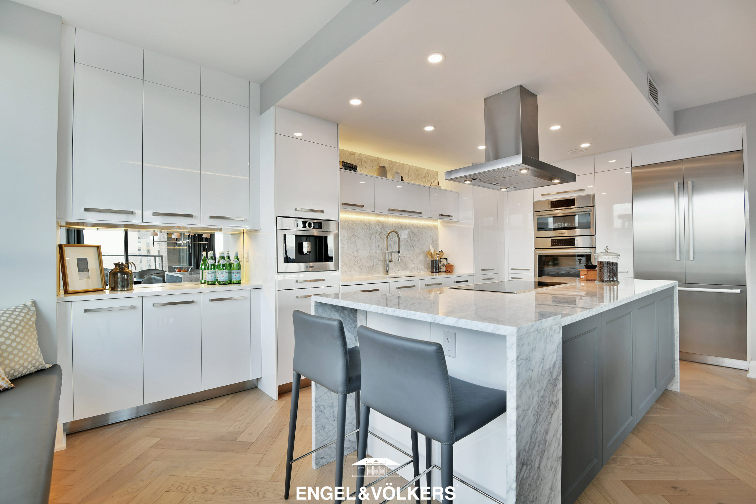 The template is laid with light-toned wide plank white oak floors in a classic herringbone pattern throughout the space. With a dramatic entry setting the tone, you are prepared for the open concept living room/dining and kitchen that is layered with glossy white lacquered cabinetry, stainless steel Bosch 800 Series appliance package including integrated coffee station, white Carrara marble double waterfall island, and wonderful views that only the capital can claim: the Peace Tower and the Ottawa River.
