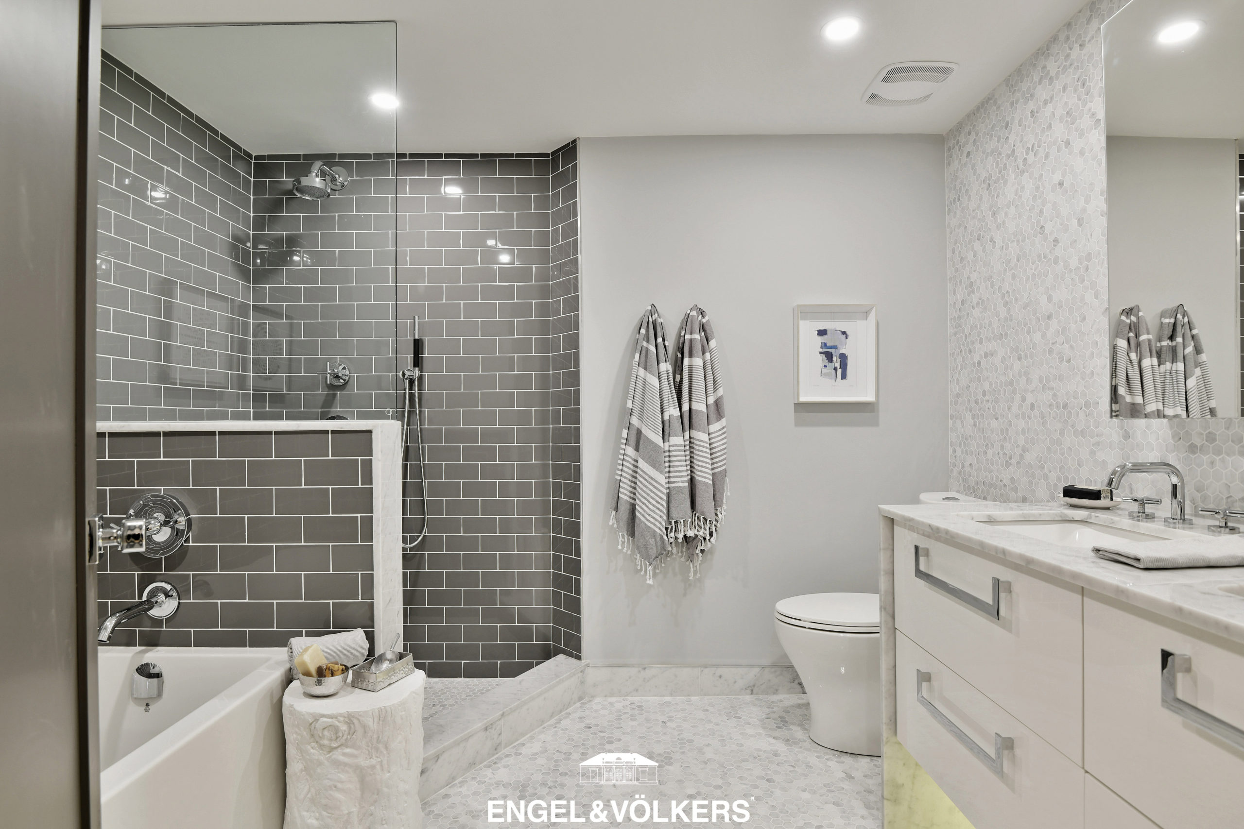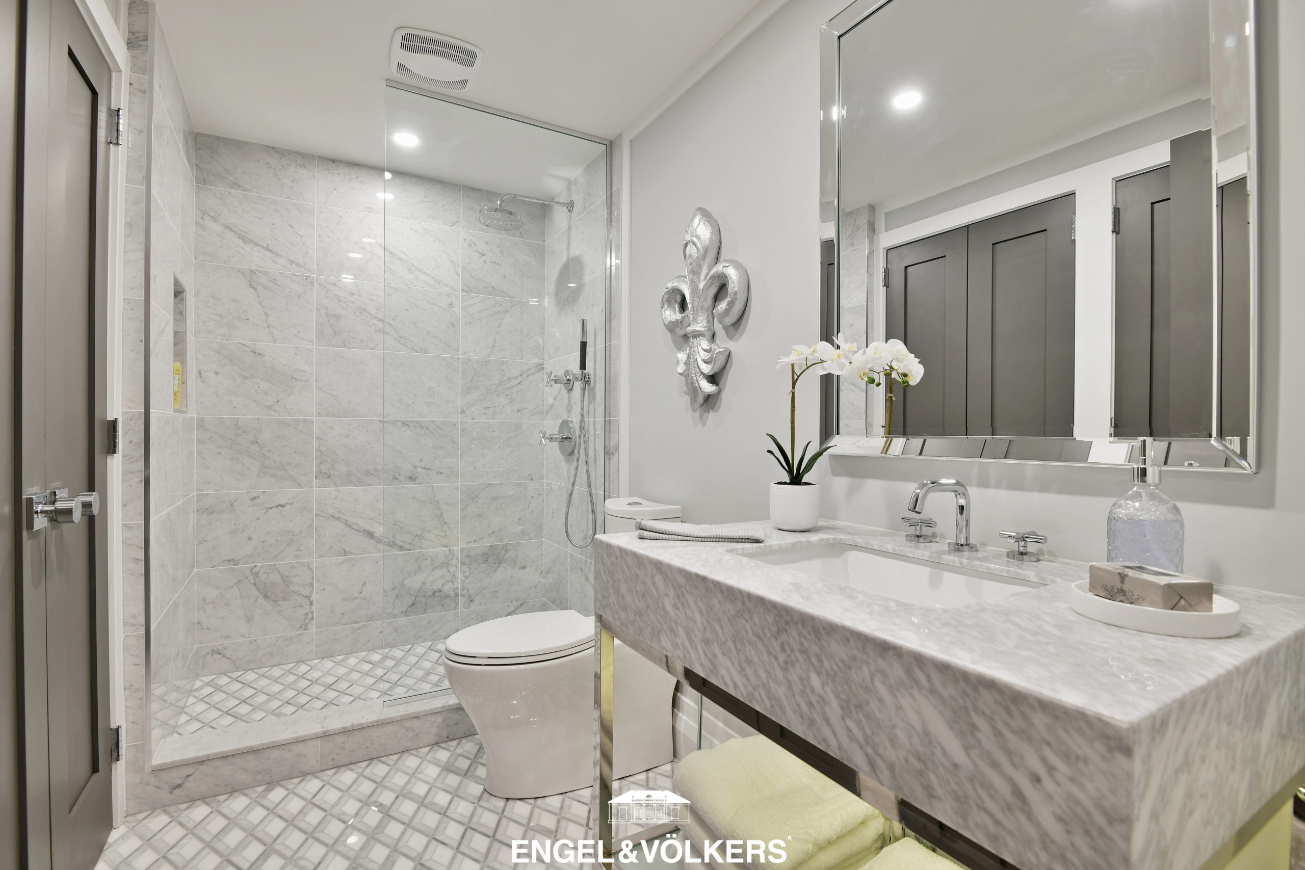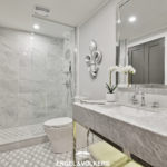 A den/library is tucked away and allows for privacy and quiet moments. The sleeping quarters are accented with the same level of detail with glossy customized cabinets that provide organized storage, and the luxe main bath that boasts lots of storage for linens and has been detailed with classically intricate heated marble floors, glass shower enclosure, and marble vanity with open shelving.