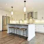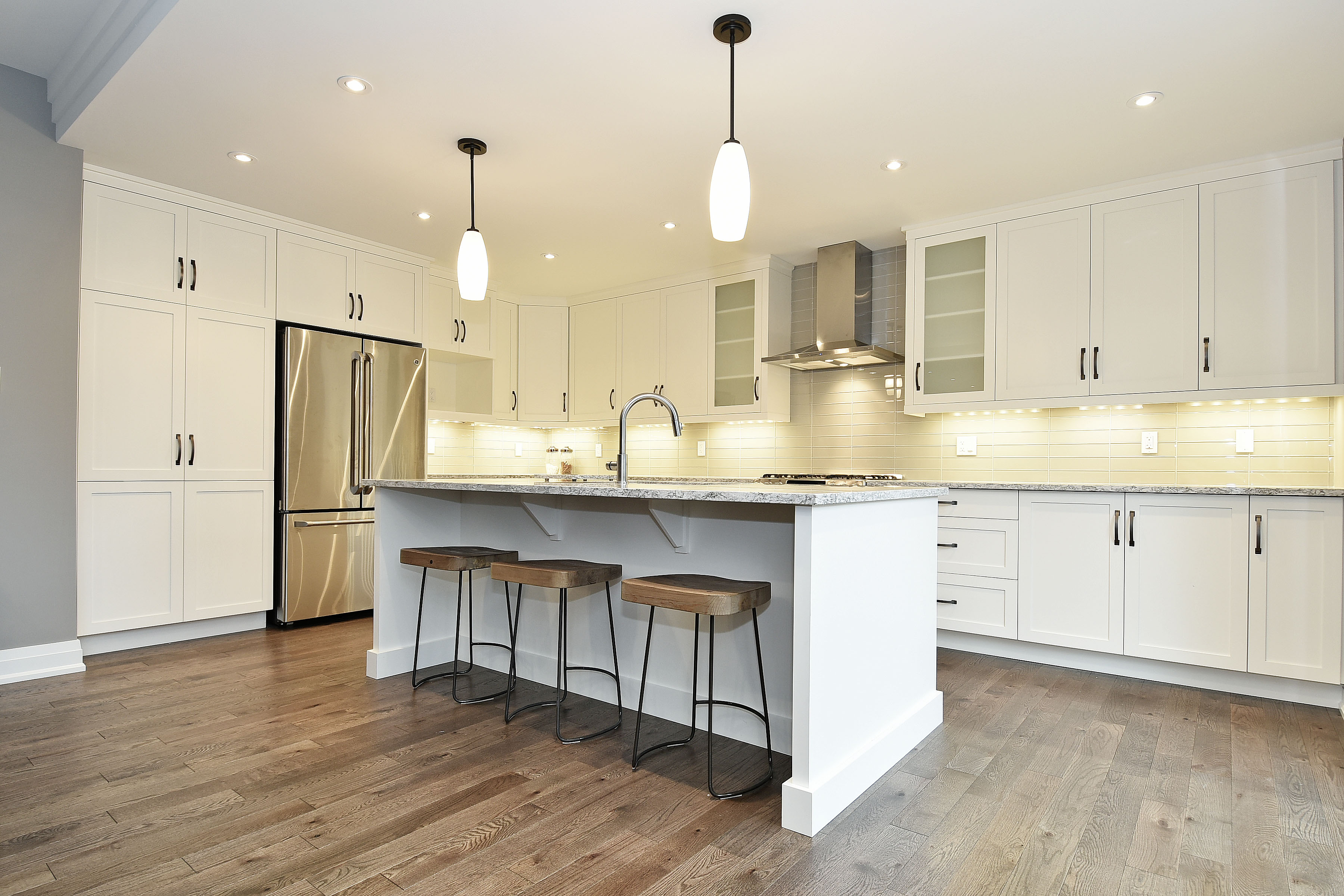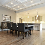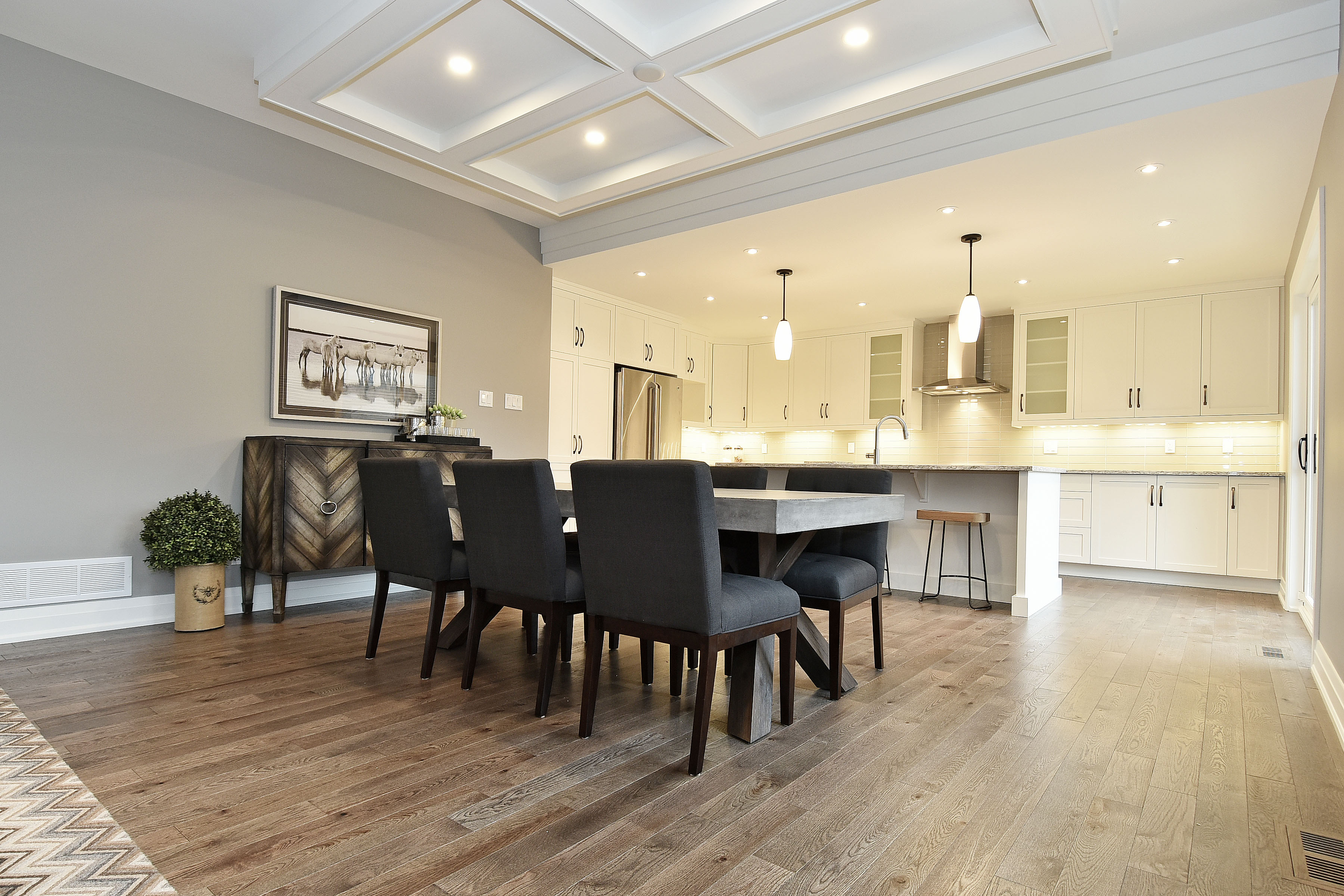 The Shaker style kitchen in white was customized by Deslaurier Kitchens and finished with classic details such as oiled bronze door hardware and cabinets that are built to the ceiling. Seamless, solid surface counters are a beautiful match to the sleek glass tile back splash that contemporizes the timeless design. Stainless steel appliances and contemporary lighting complete the kitchen while the dining area has been distinctively and cleverly defined integrating a handsome coffered ceiling into the plan.