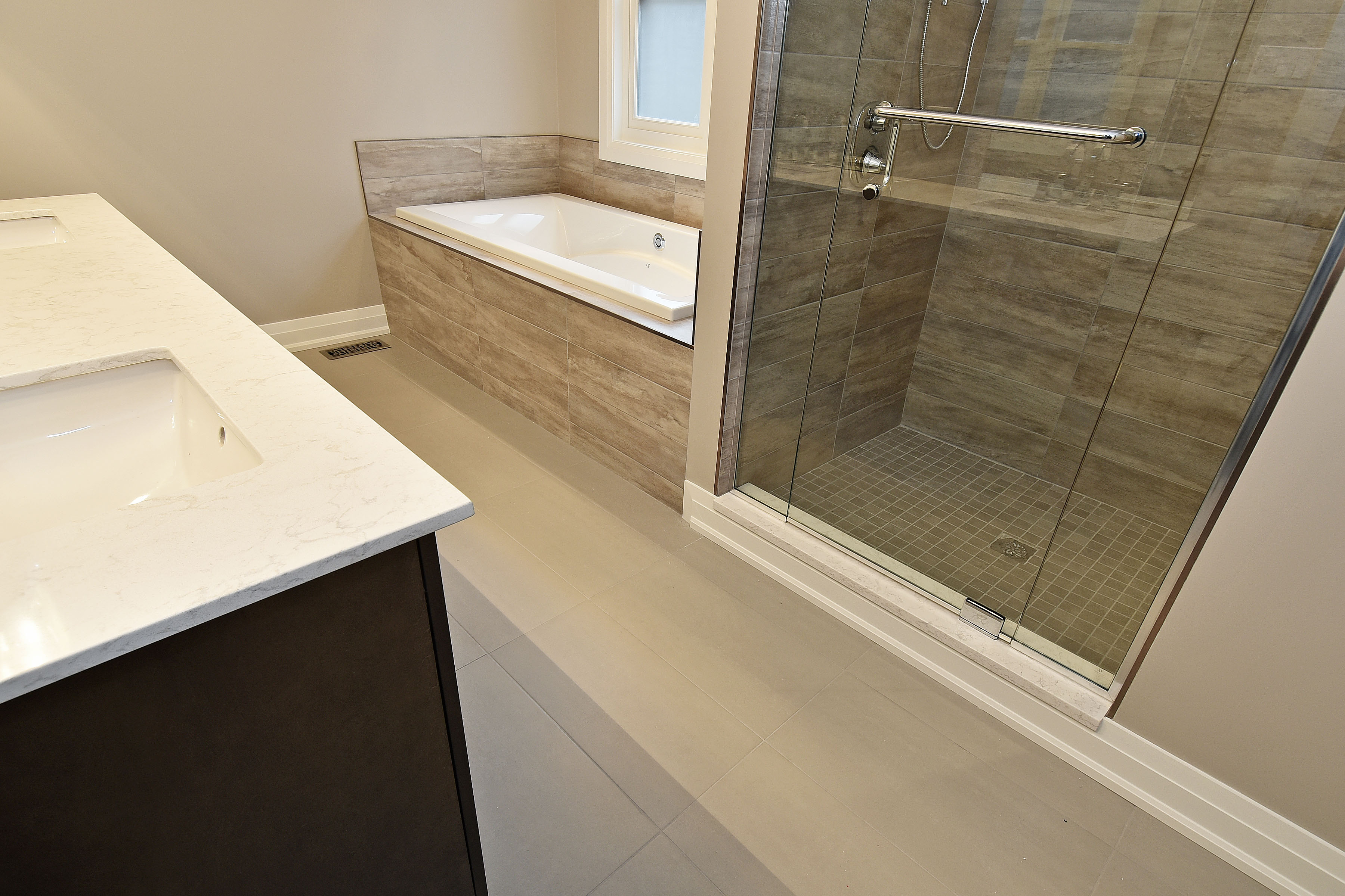 The master on this level is bright and generously proportioned offering a walk-in closet as well as wall-to-wall closet. The master ensuite bath is what one would expect with double vanity, separate glass shower enclosure and soaking tub, all complimented with beautiful tiling details.