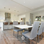 Custom floating shelves highlight the accent wall of the formal entertaining space and are stained in a warm mahogany tone and offset with the softly toned large tiles throughout the space.