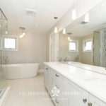 The master is a wonderful respite away from it all. Spaciously designed and filled with light it will easily accommodate a king size bed. A large walk-in closet with built-ins will take an island if preferred. The piece-de-resistance in this home is the spa-like bath finished with fresh and sleek white details that convert to an invitation to relax! Featuring a double vanity with Cambria “Carerra marble-like” counter surfaces it also offers a tall oversized glass shower enclosure with rain head and a separate telephone set for rinsing. A separate freestanding egg-shaped soaking tub with floor mounted fixtures is the finishing piece in this great space.
